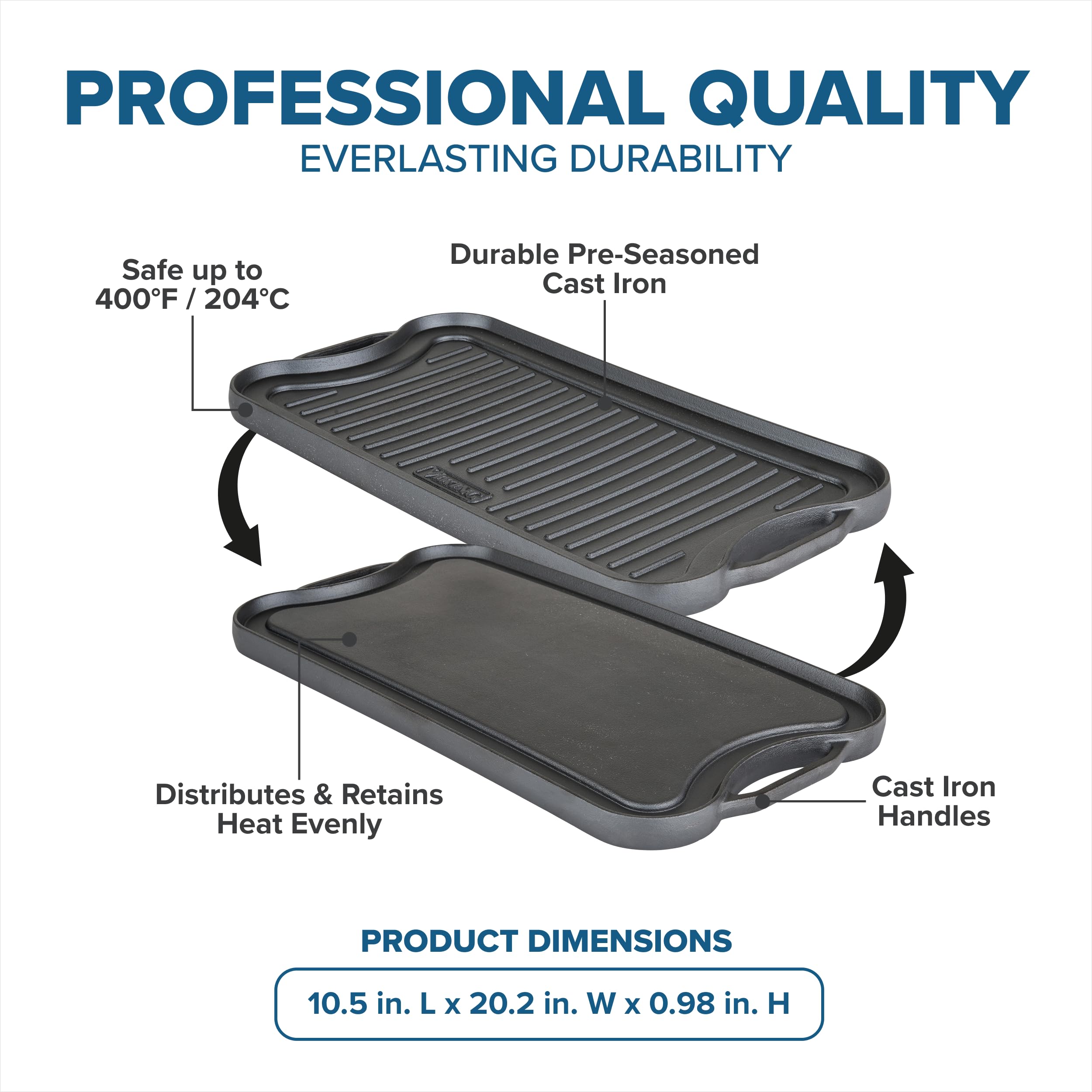 STYLISH DURABLE DESIGN: Our cooktop griddle is constructed with durable pre-seasoned cast iron for long-lasting reliability, and features a sleek matte black finish which complements modern home kitchen decors. This flat skillet is oven friendly, compatible with electric, gas, and grill cooking sufaces, and is safe up to 400 degrees F (204 degrees C)
