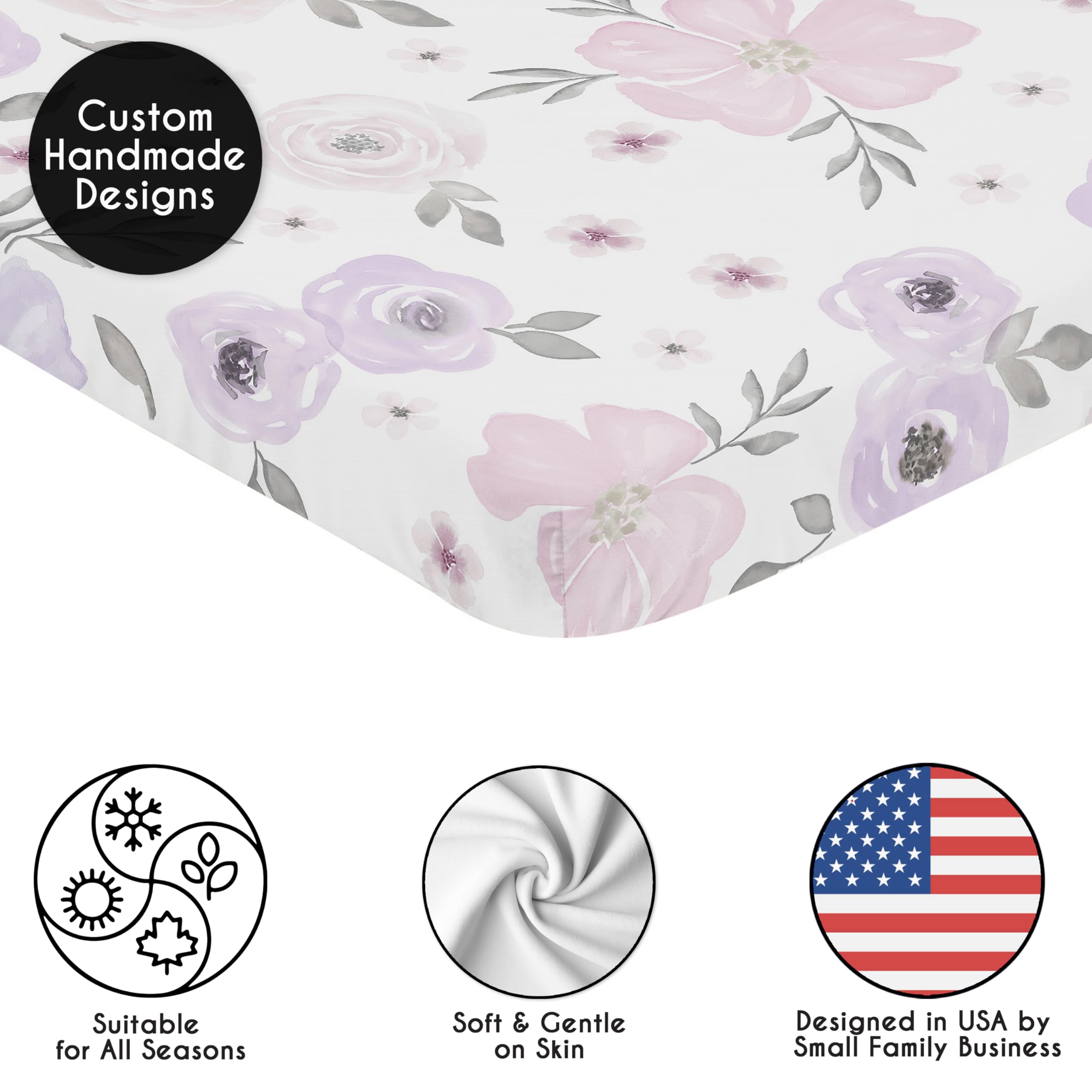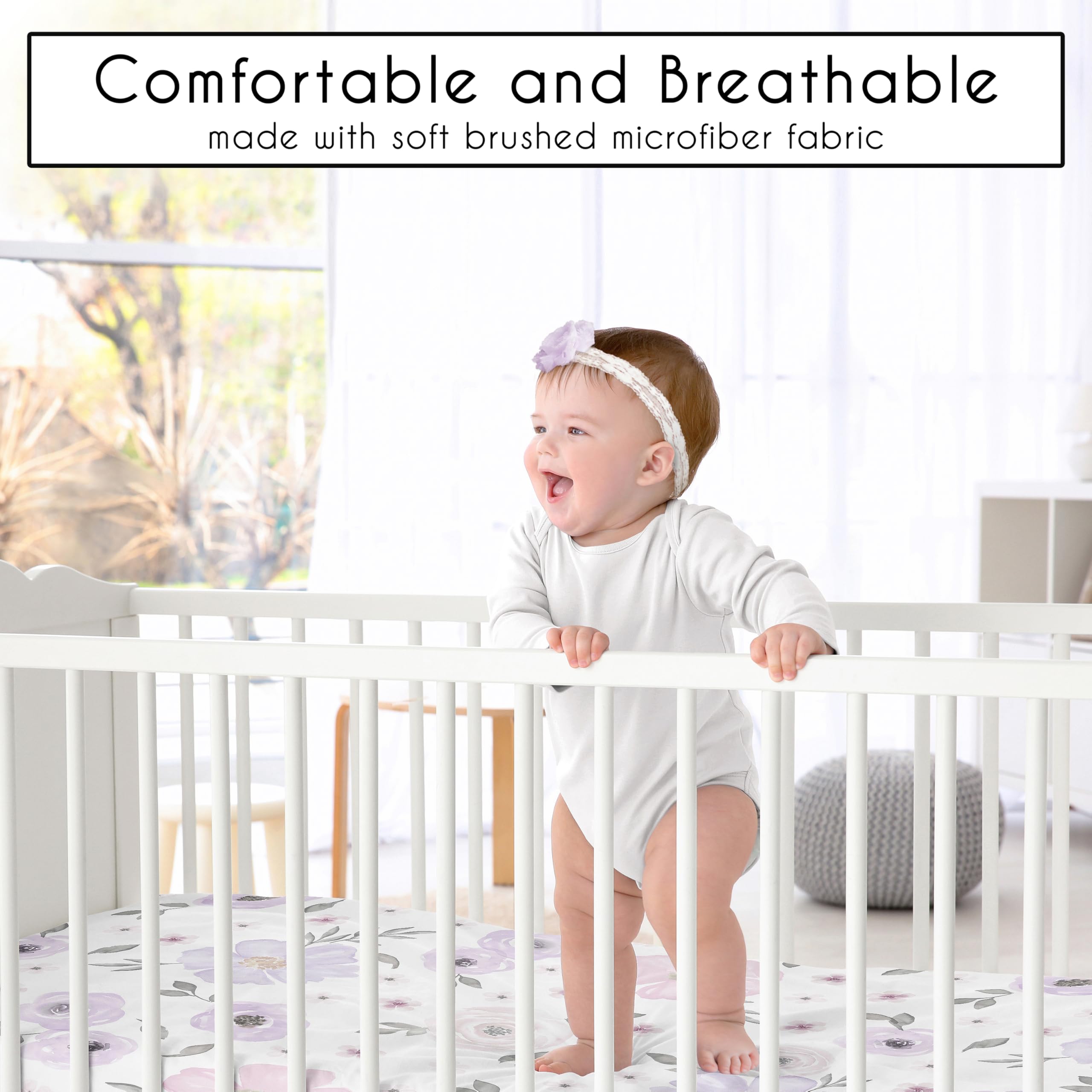 SNUG FIT: Includes (1) Mini Crib Mattress Sheet 24in. x 38in. x 5in. Our newborn mini crib sheets fit snugly, with premium elastic sewn around the entire bottom edge for a secure fit on most smaller size cribs, play yards, & portable cribs to reduce shifting & bunching. This brushed microfiber pack and play sheet features an exclusive design of purple lavender & grey shabby chic, farmhouse, bohemian, garden, watercolor, floral print & is gentle on delicate skin. WILL NOT FIT STANDARD SIZE CRIBS.