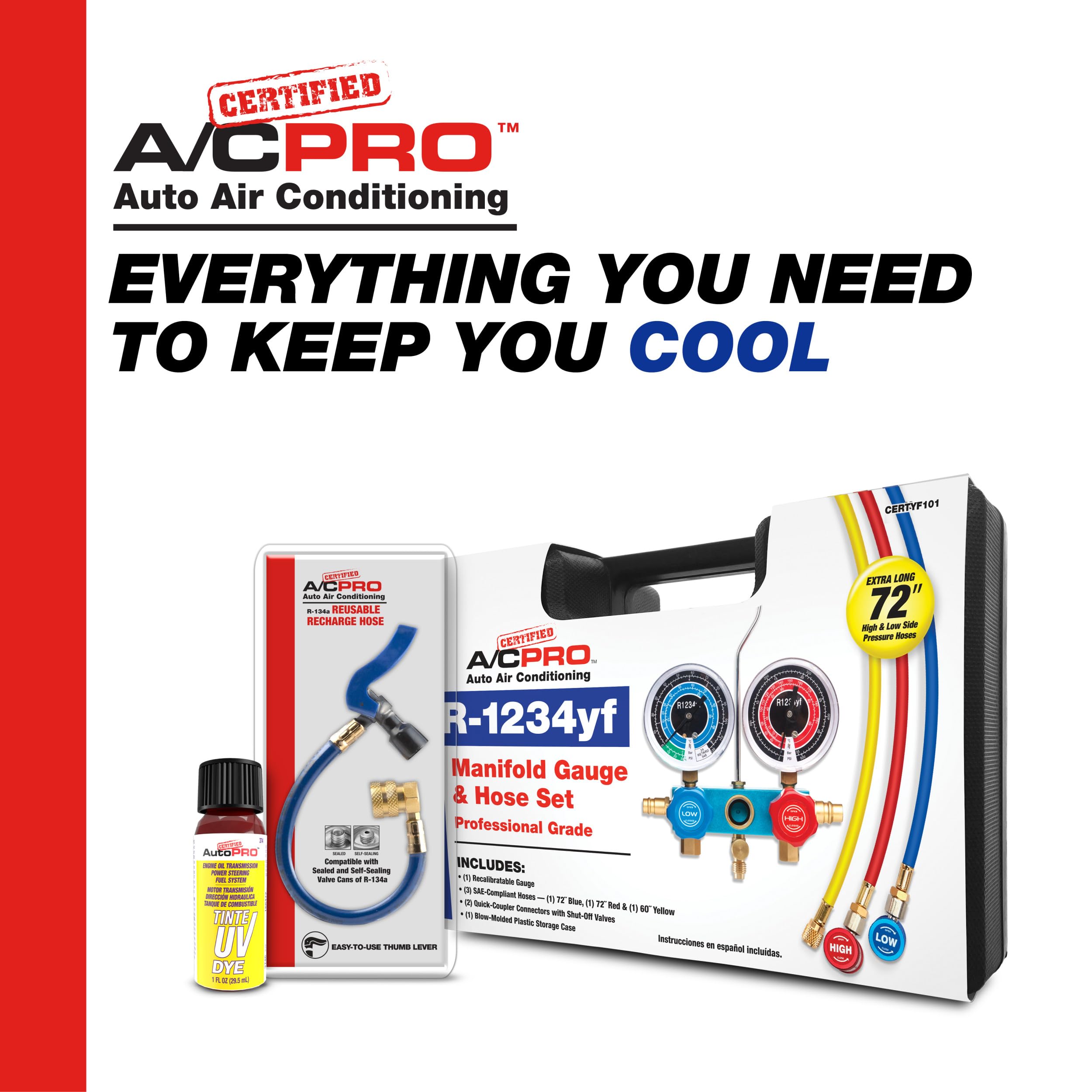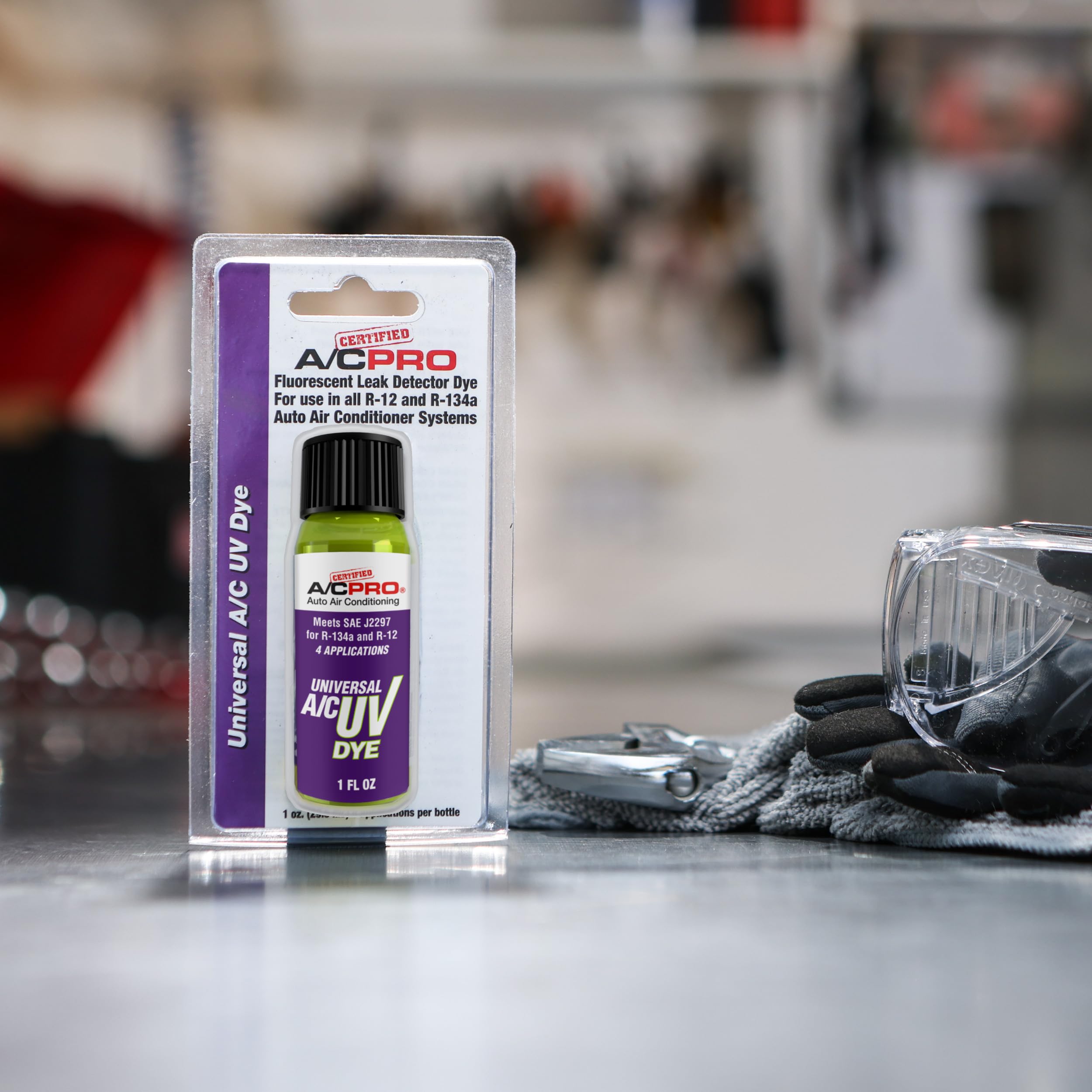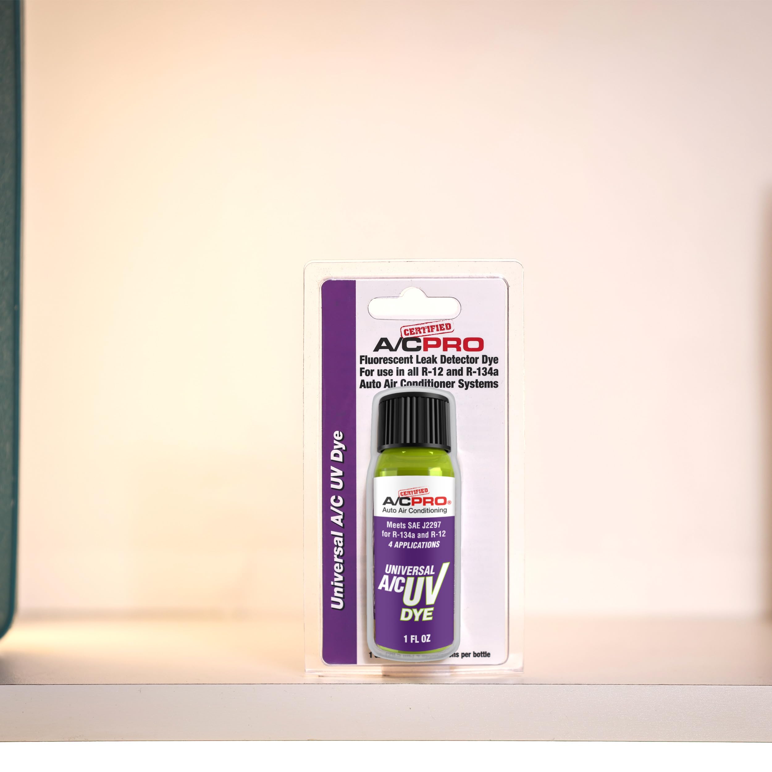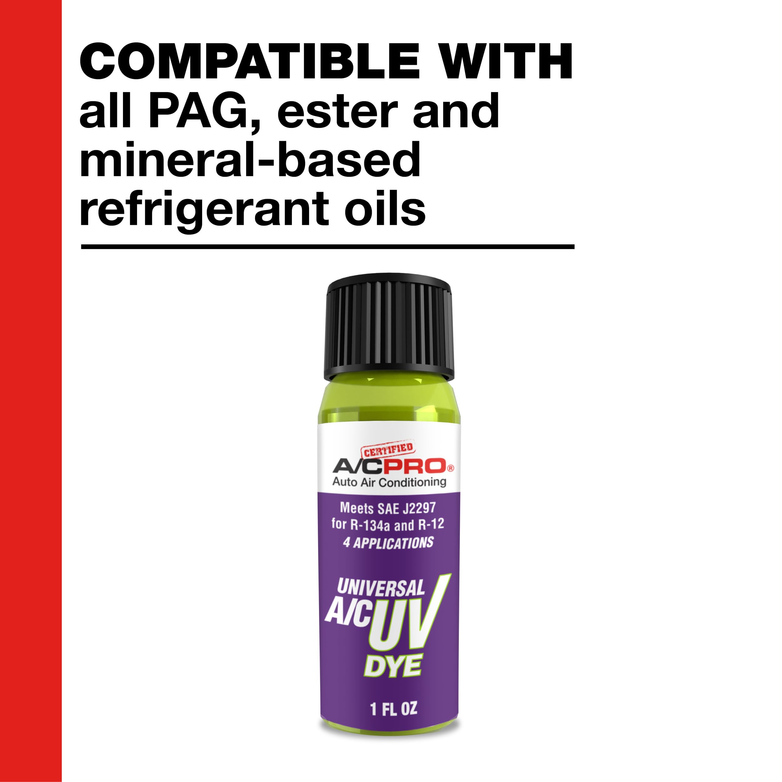 Certified A/C Pro Automotive Air Conditioning Universal A/C UV Dye is a UV leak detection dye to help detect leaks in automotive air conditioning systems. Can be used in all R-134A, R-12, and R-22 systems. Compatible with all PAG, ester, and mineral based refrigerant oils. Contains four one quarter ounce applications of universal air conditioning system UV leak detection dye. Meets SAE J2297.