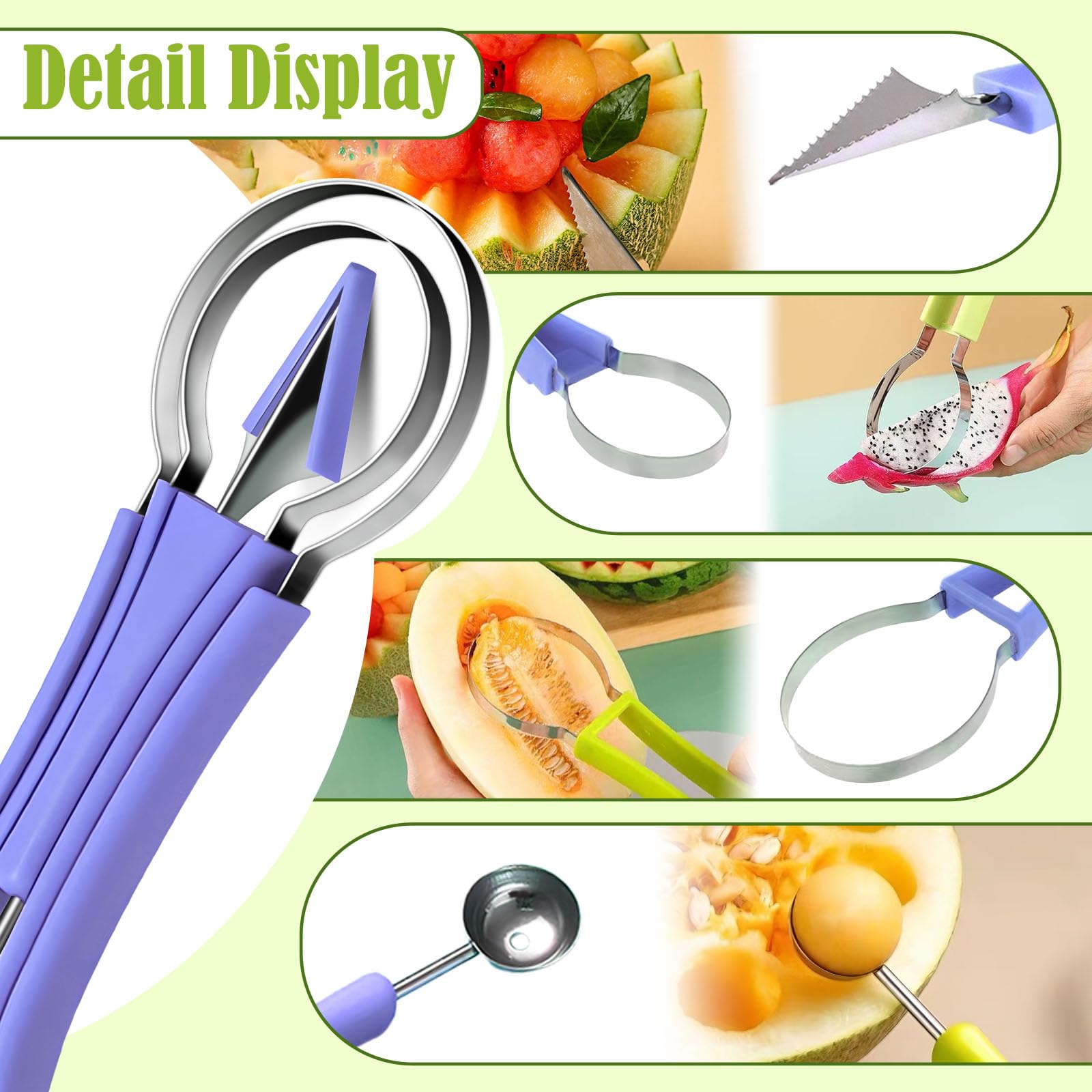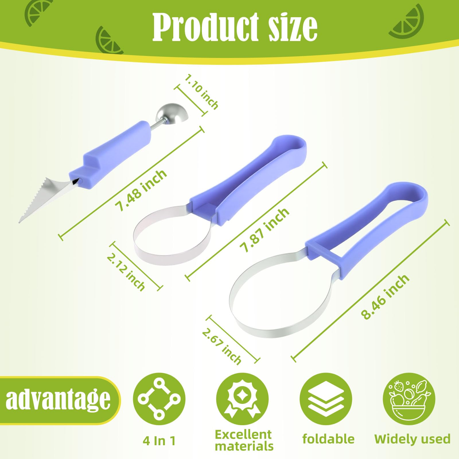 4 In 1 Stainless Steel Fruit Tool Set: Unique design, function includes Melon Baller Scoop Set for digging, carver knife for fruit carving tools, 2 size watermelon scooper for removing and digging flesh of fruits and vegetables