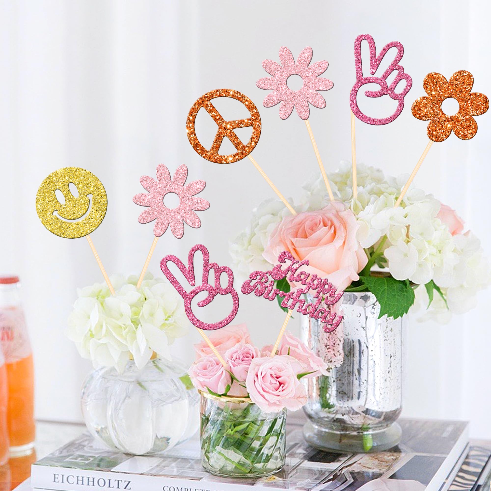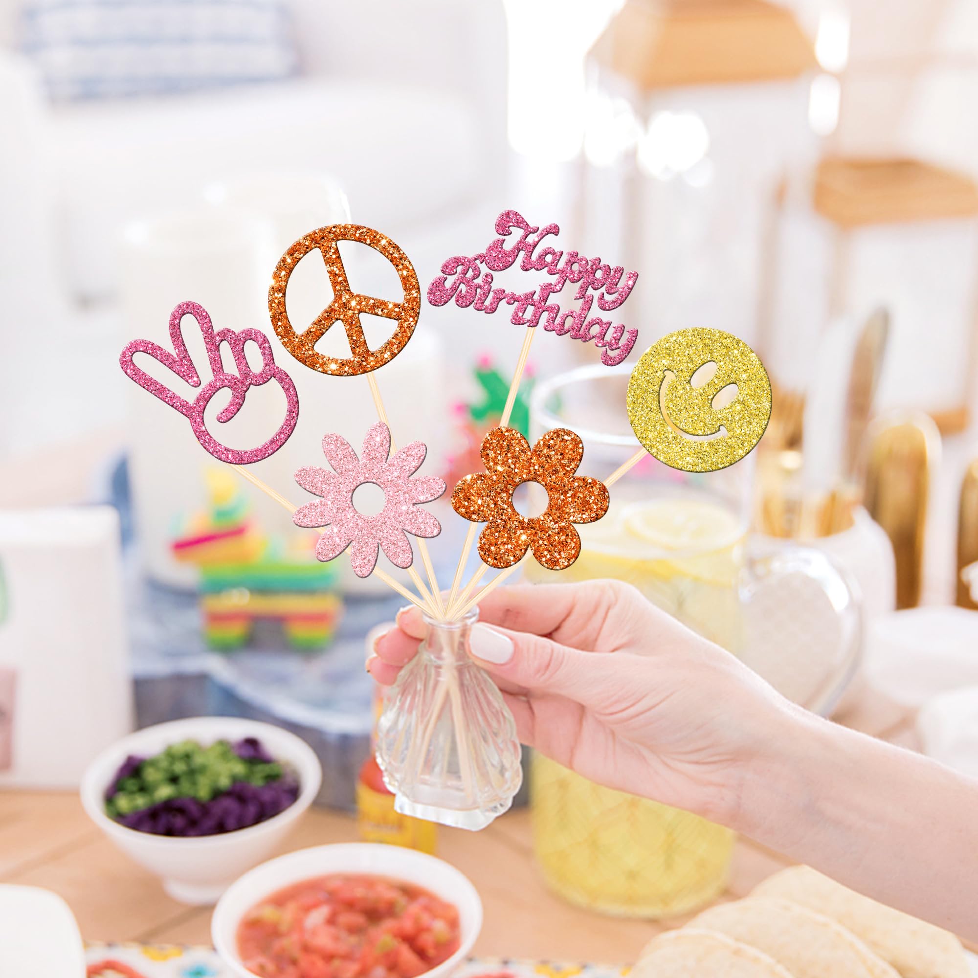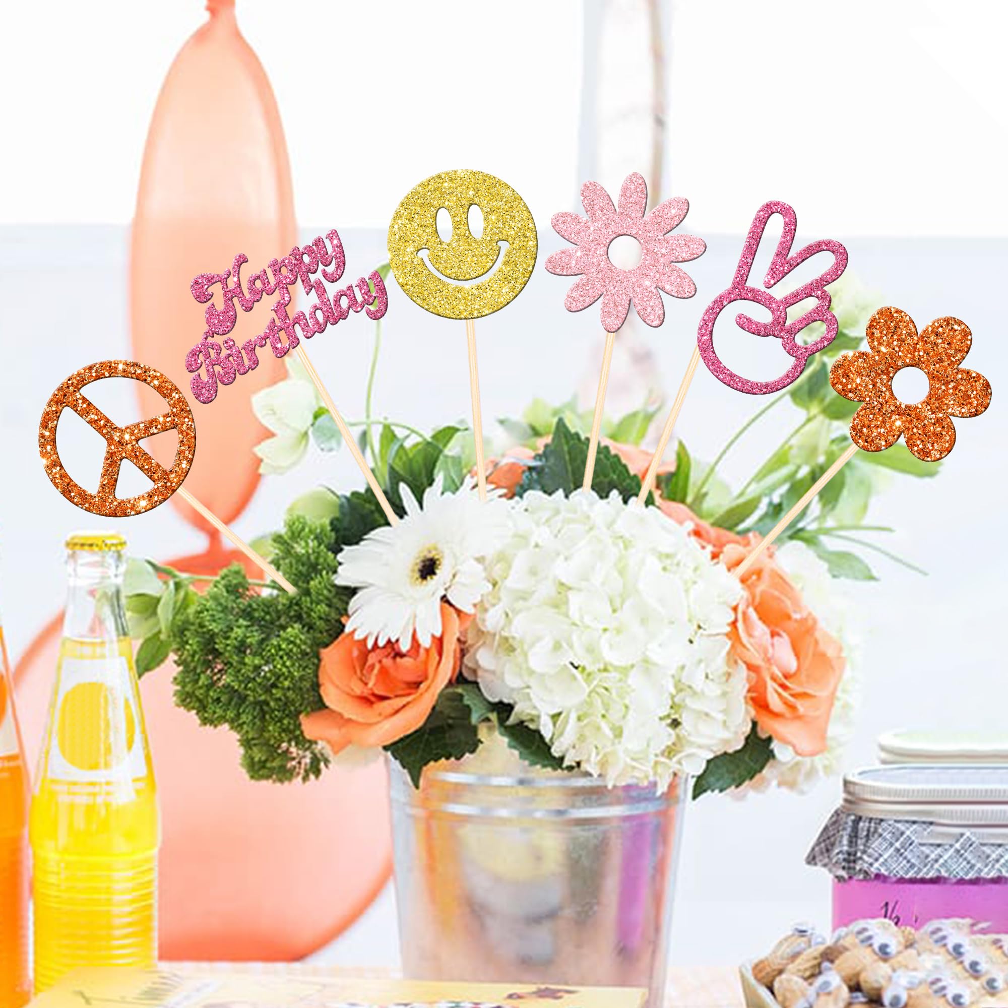 12 PCS Hippie Party Centerpiece Sticks Double Sided 60s Retro Boho Dasiy Flower Sun Peace Sign Hand Table Flower Centerpieces Sticks for Hippie Theme Baby Shower Birthday Party Centerpiece Decorations Supplies Perfect for hippie theme party, 60s retro theme party, peace theme party, two groovy carnival theme party, baby shower theme party, kids birthday party centerpieces floral decorations supplies. Pack of 12 pcs,2 pcs of each design. The size is 3.4*10.6 inch / 4.7*9.8 inch / 3.2*10.6 inch / 3.4*10.6 inch / 3.2*10.4 inch / 2.8*10.8 inch ( with stick ) Made of high quality double-sided glitter paper card stock and food grade sticks,thick and sturdy. These centerpiece sticks are double-sided glitter, and they are intended for decoration only, please do not put them in oven or microwave. If the item you received has any defects, please contact us for refund.we will deal with it within 24 hours.