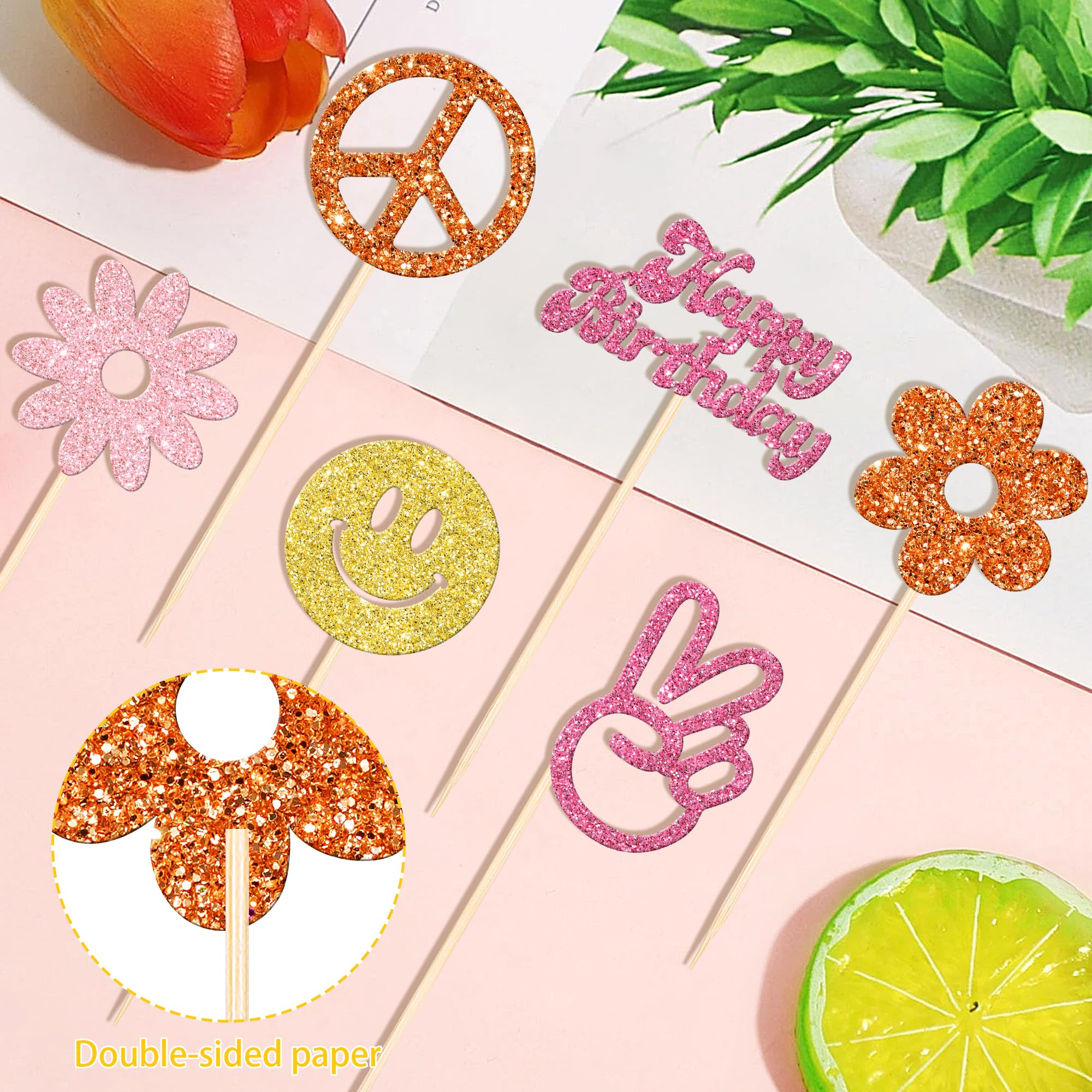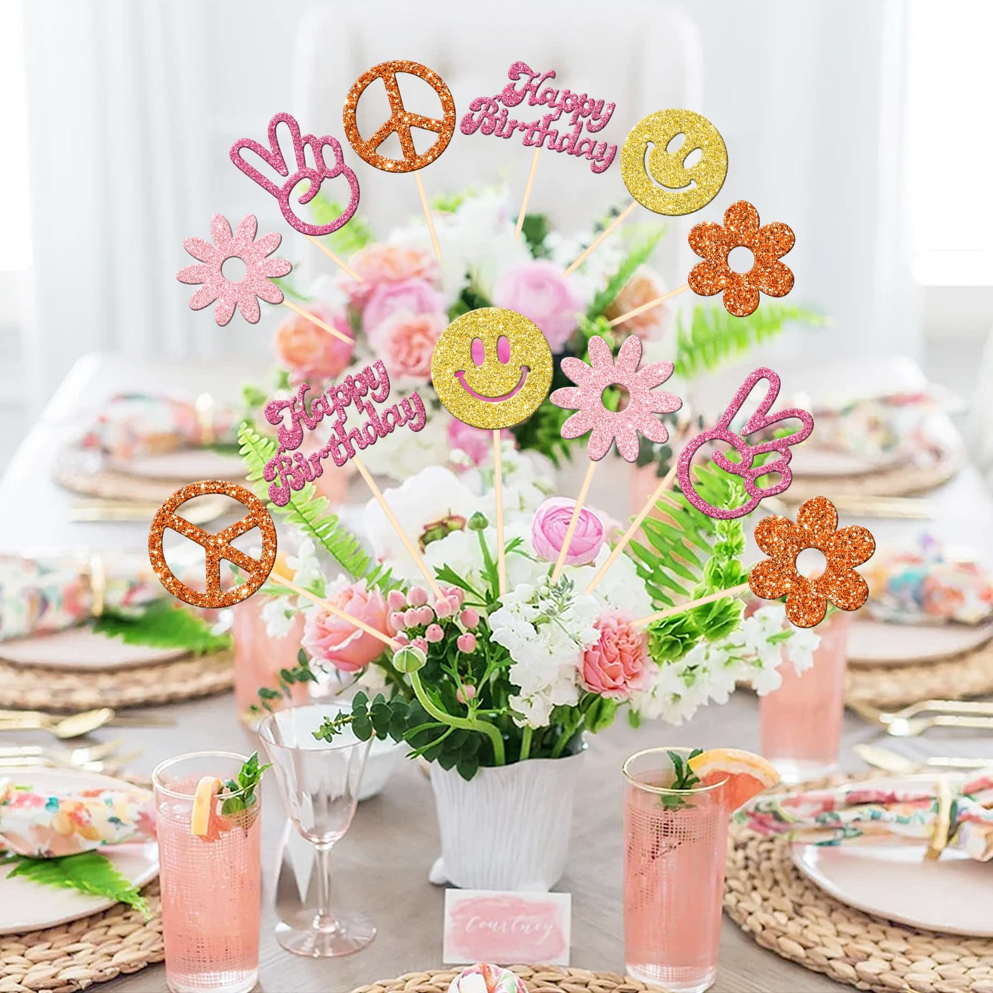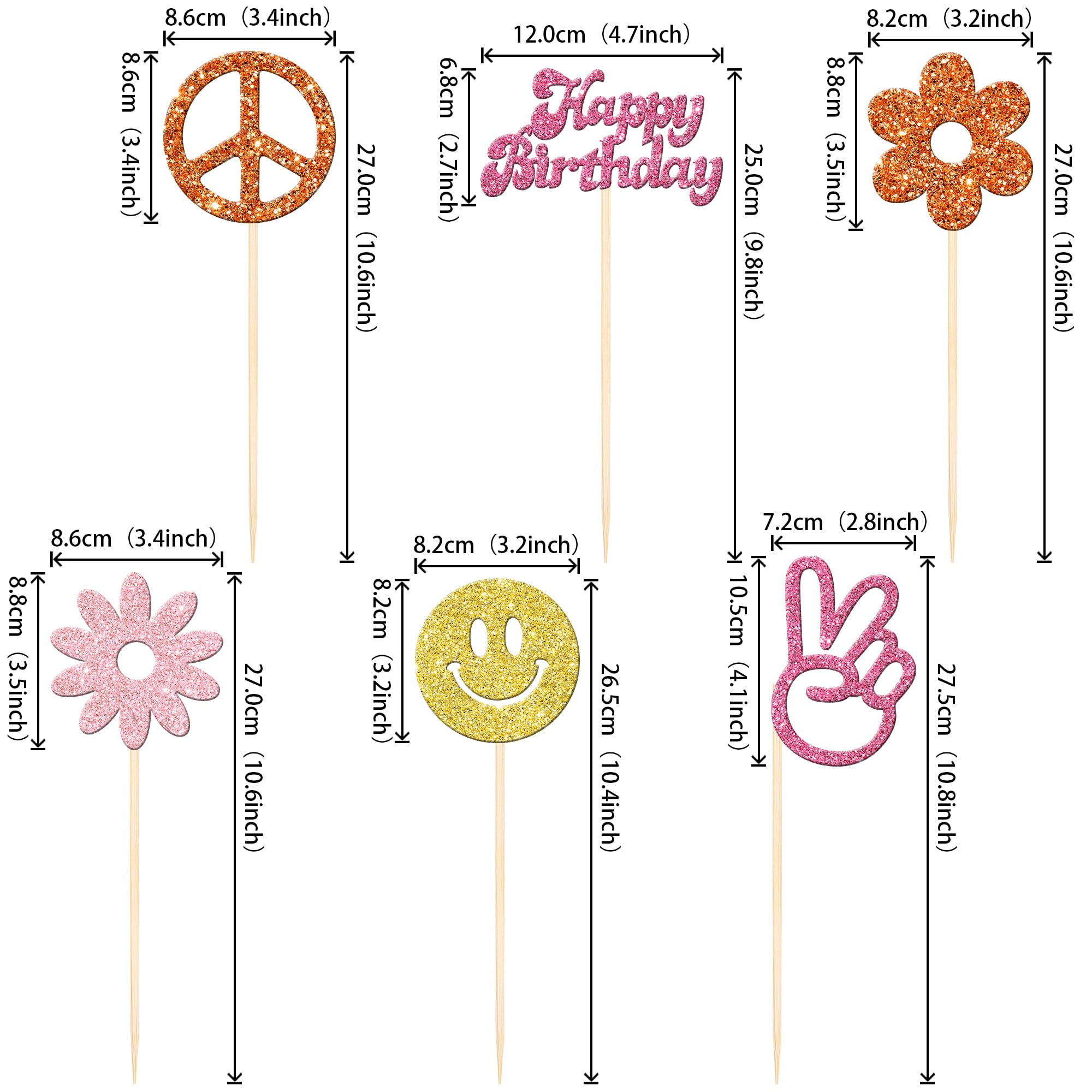 12 PCS Hippie Party Centerpiece Sticks Double Sided 60s Retro Boho Dasiy Flower Sun Peace Sign Hand Table Flower Centerpieces Sticks for Hippie Theme Baby Shower Birthday Party Centerpiece Decorations Supplies Perfect for hippie theme party, 60s retro theme party, peace theme party, two groovy carnival theme party, baby shower theme party, kids birthday party centerpieces floral decorations supplies. Pack of 12 pcs,2 pcs of each design. The size is 3.4*10.6 inch / 4.7*9.8 inch / 3.2*10.6 inch / 3.4*10.6 inch / 3.2*10.4 inch / 2.8*10.8 inch ( with stick ) Made of high quality double-sided glitter paper card stock and food grade sticks,thick and sturdy. These centerpiece sticks are double-sided glitter, and they are intended for decoration only, please do not put them in oven or microwave. If the item you received has any defects, please contact us for refund.we will deal with it within 24 hours.