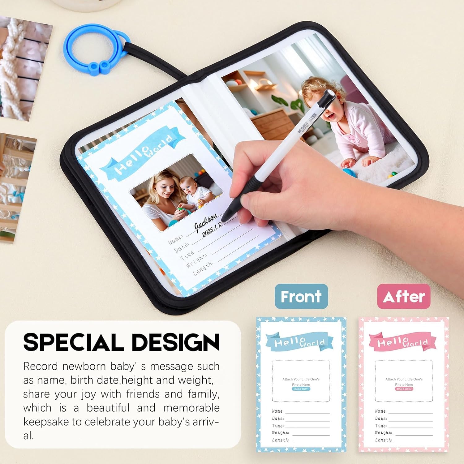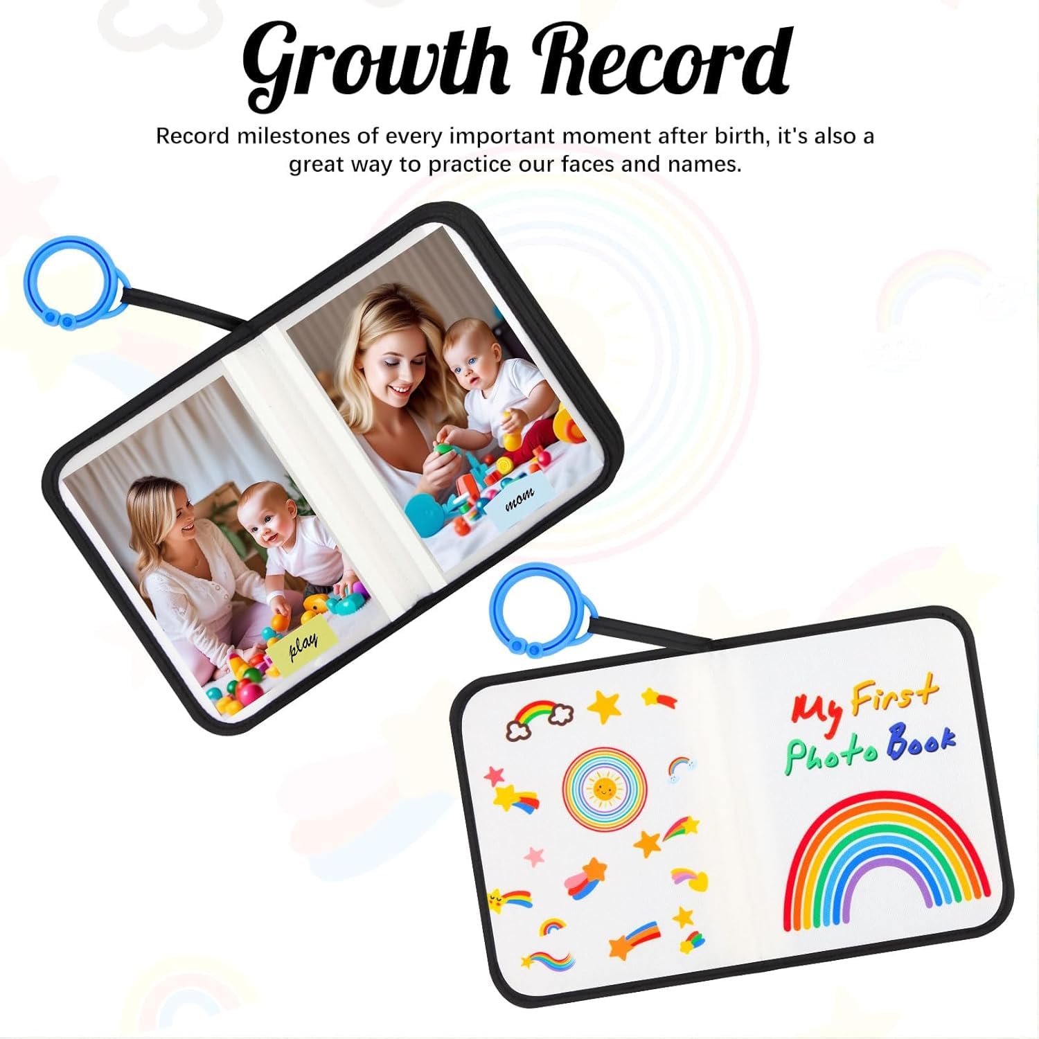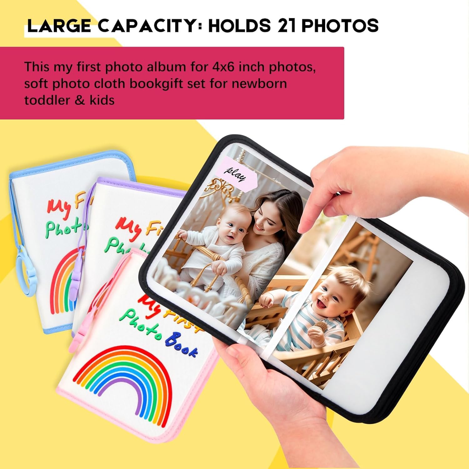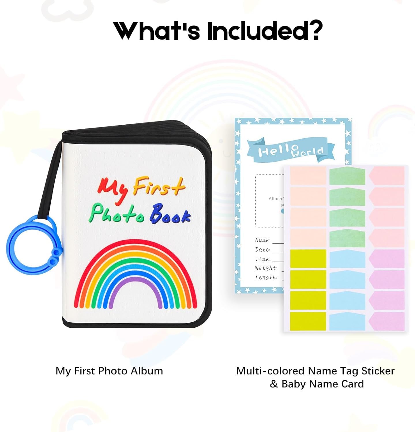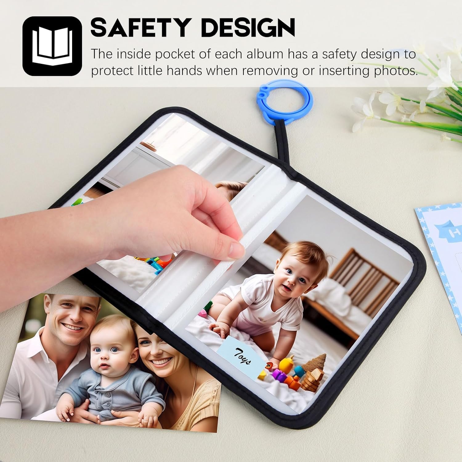 PERFECT SIZE: This small baby photo book is perfect for baby's tiny hands. Holds up to 21 4x6 inch photos. Clear photo pockets, can protect pictures from baby's drool, pictures won't stick to pockets, easy to insert and remove. The star hook can be easily attached to the cot, pram, etc. Child safety mirror on one side in the middle of the last page of the album.