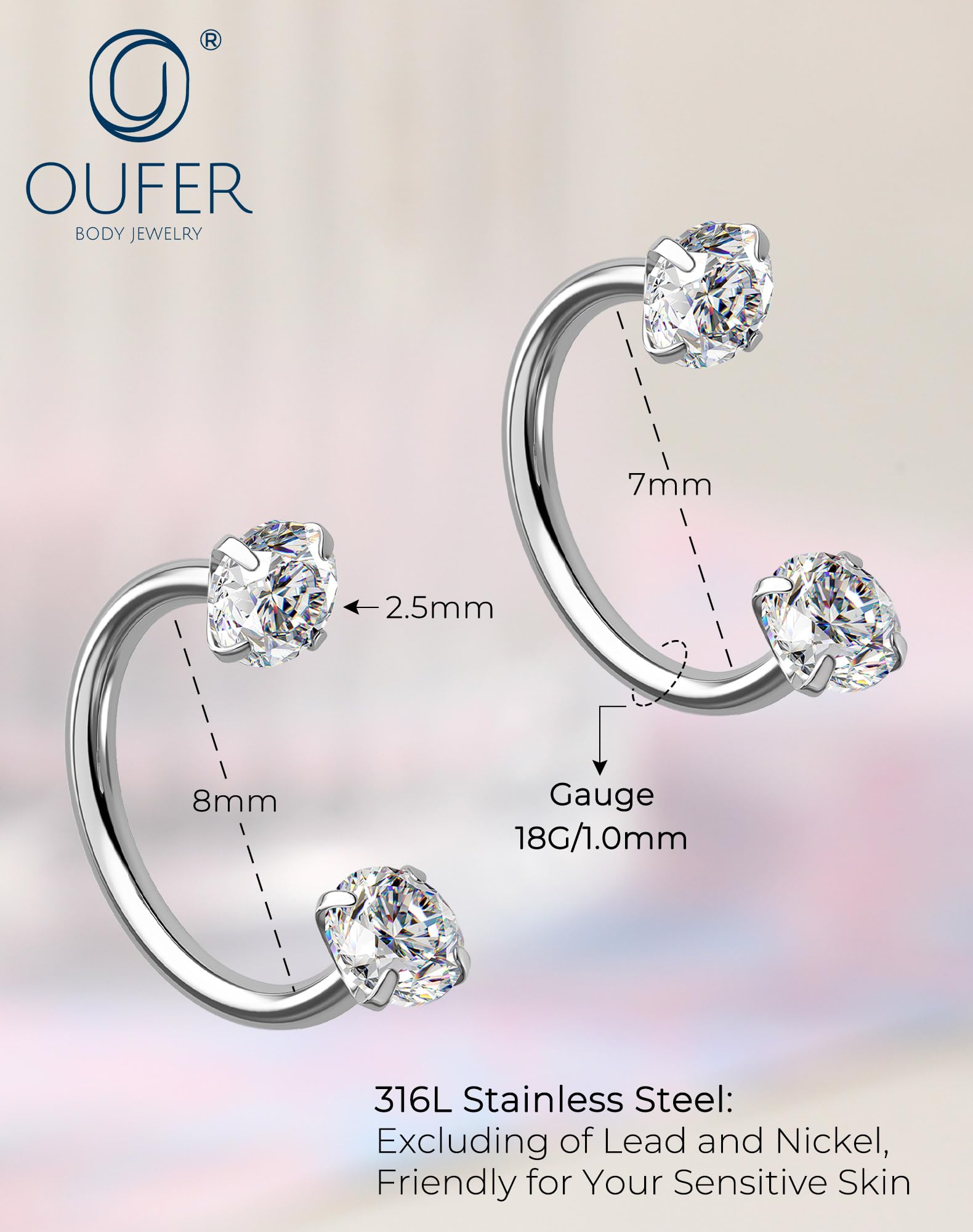 DIMENSIONS: 2pcs nose rings hoops available in 7mm and 8mm sizes with 2.5mm crystal stones, 18G (1.0mm) thickness for comfortable wear