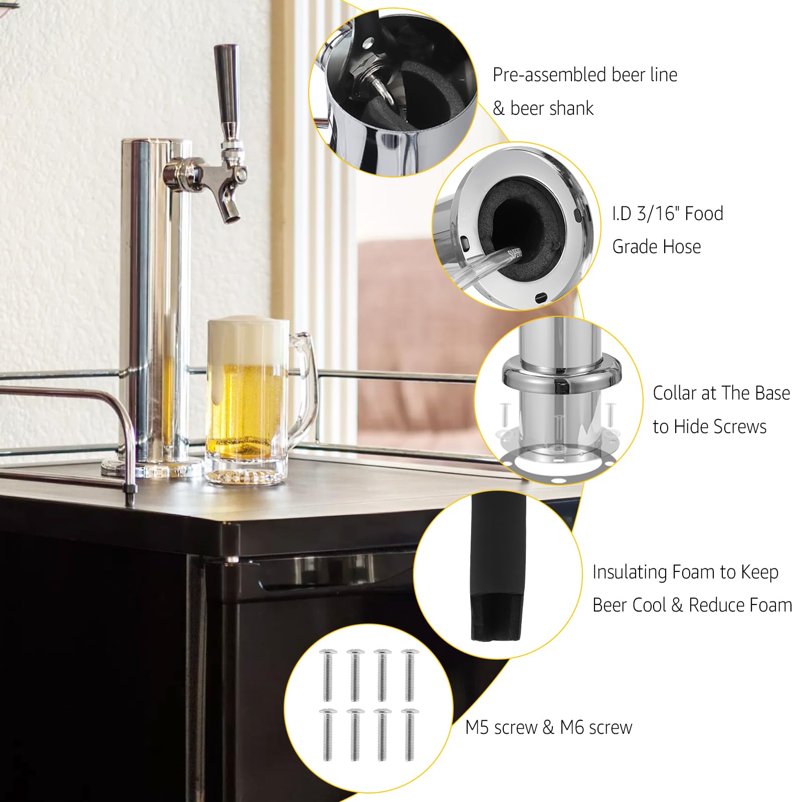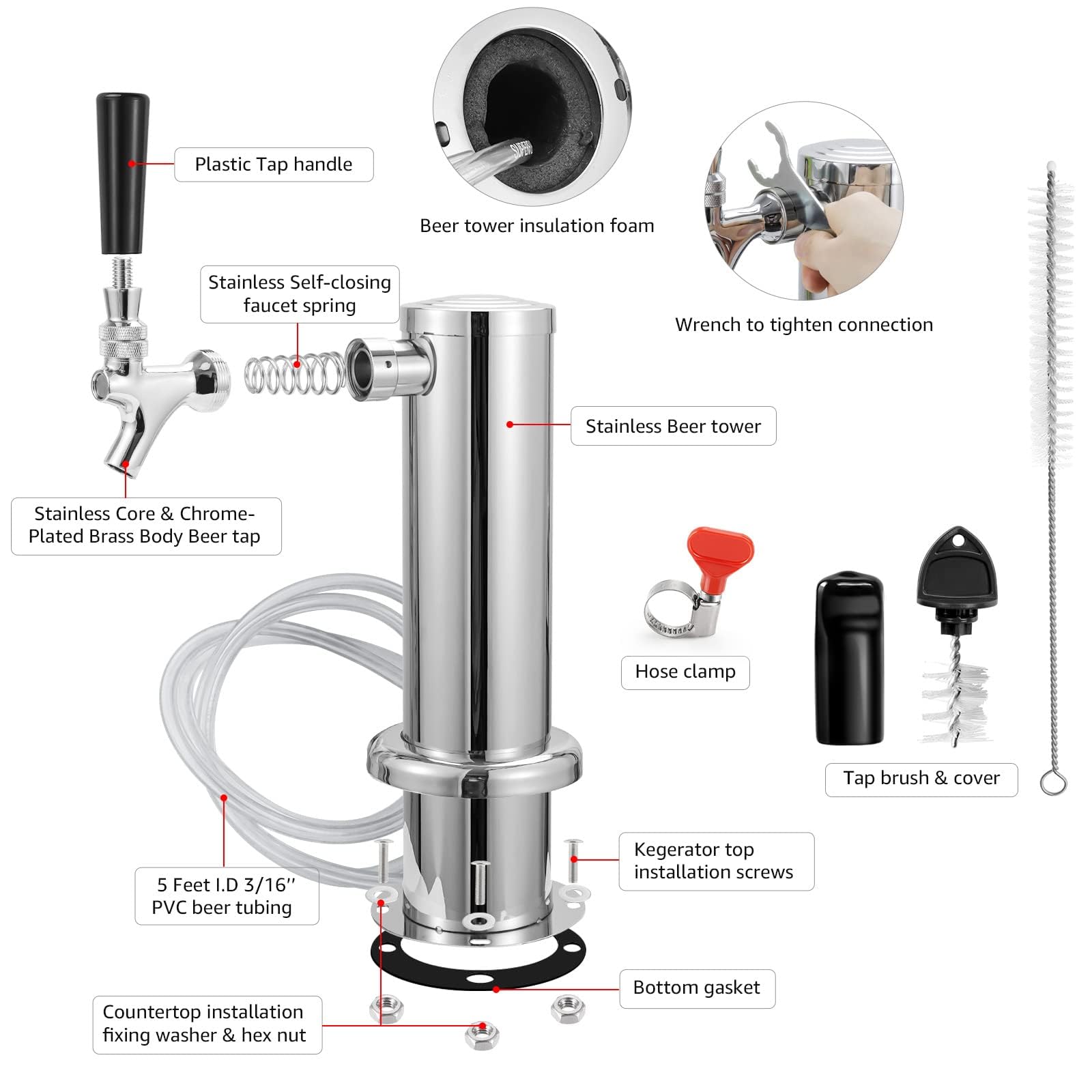Healthy Stainless Structure and Partially Pre-Assembled: kegerator tower features an all-stainless structure, chrome-plated polished brass body beer tap features a stainless core that touches beer directly, will not easy to get rust, the dispensing hose is made of healthy plastic, no ordors, keep original beer taste. brewing beer tubing and beer tower inside beer shank connector are pre-assmebled, which will improve the your efficiency to assemble and install this single tap beer tower kit.
