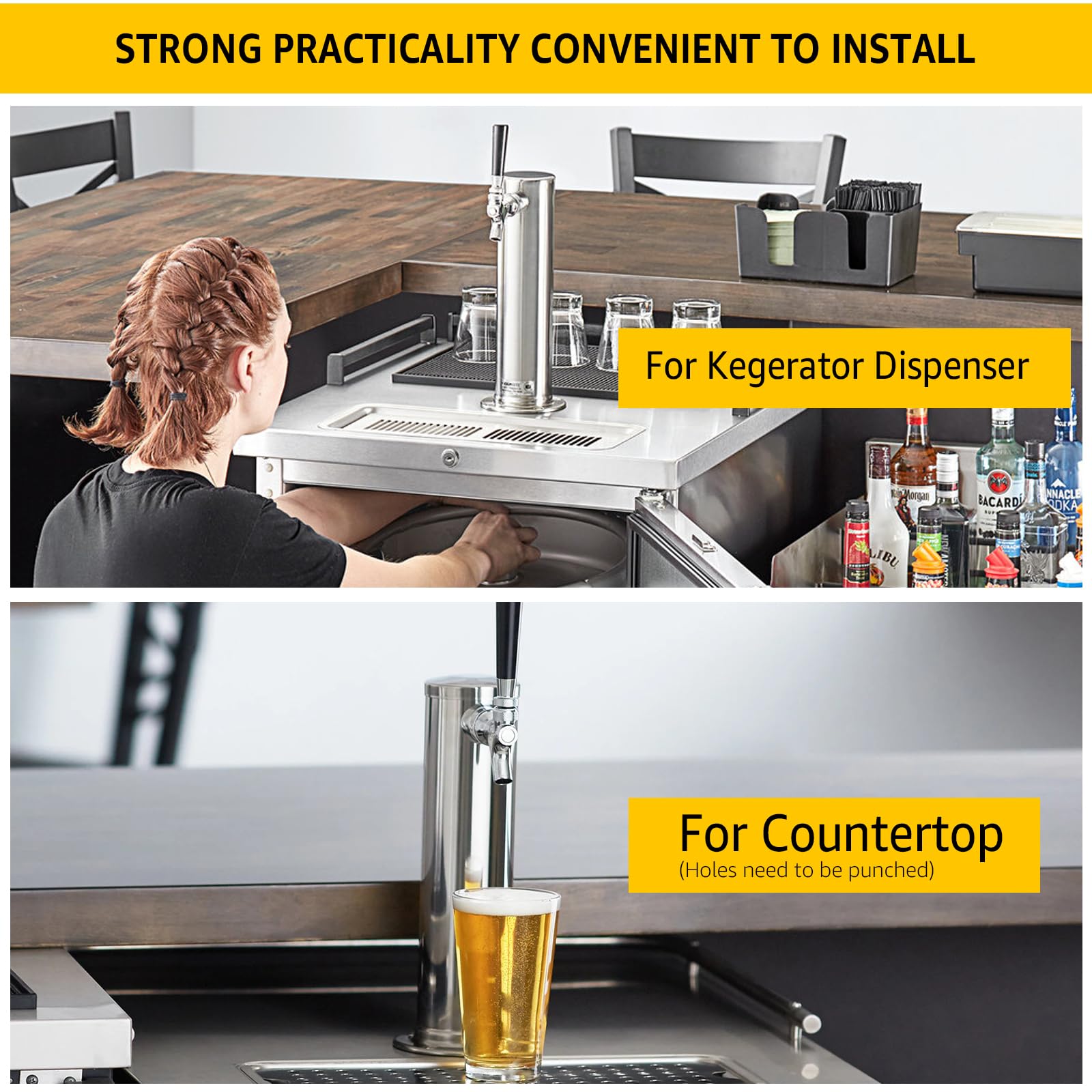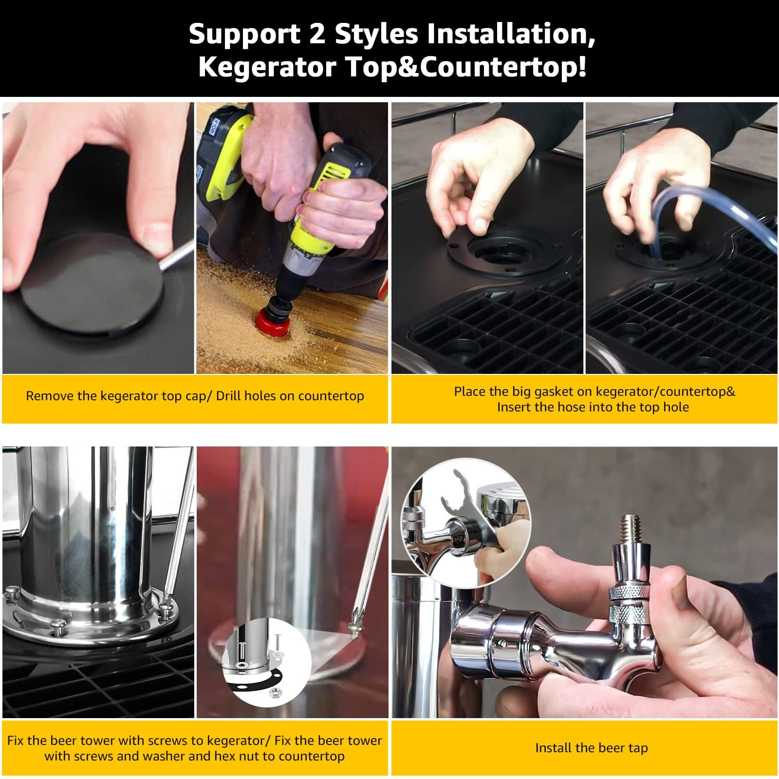 Support Kegerator and Countertop Installation: MRbrew single tap tower comes with necessary installation fittings letting it meet your 2 styles installation needs perfectly, just use installation screws to fix beer tower to kegerator top easily. need to drill holes if you want to install this beer tower to countertop, then attach little metal washers to installation screws, under beer tower, attach hex nuts to the screws to help fix installion, a great beer dispenser kit for your homebrew.