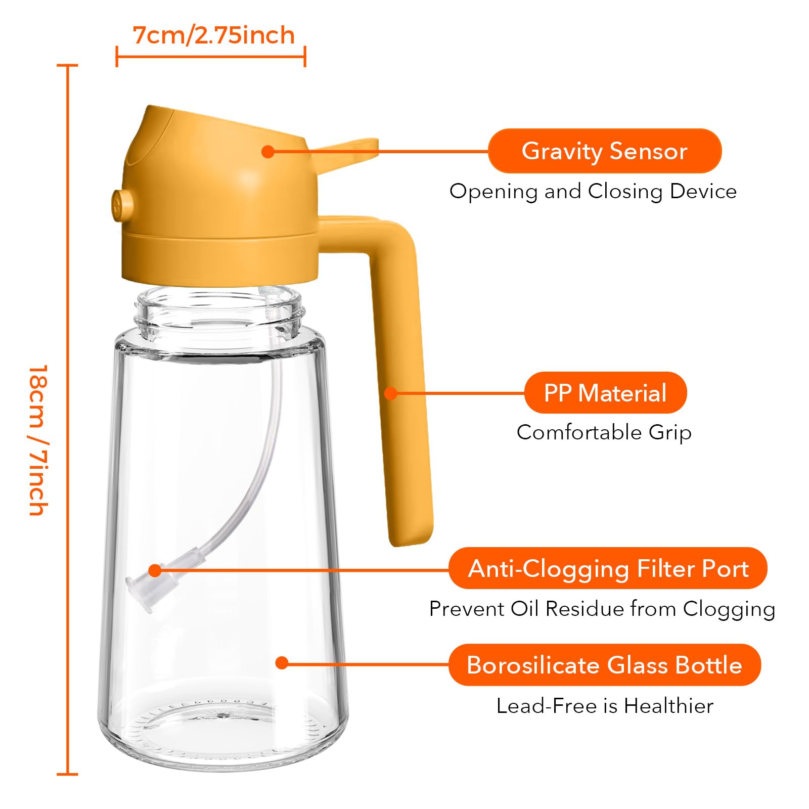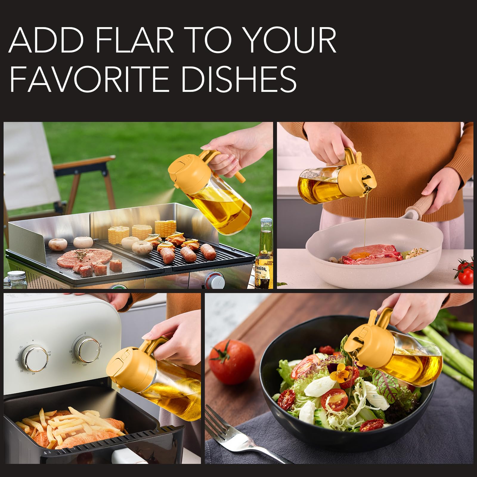 Dual-Function Design & Multi-Purpose: Oil spray bottle for cooking offers the convenience of both spraying and pouring oil, suitable for a wide range of food preparation processes such as salad dressing, griddle, roasting, grilling
