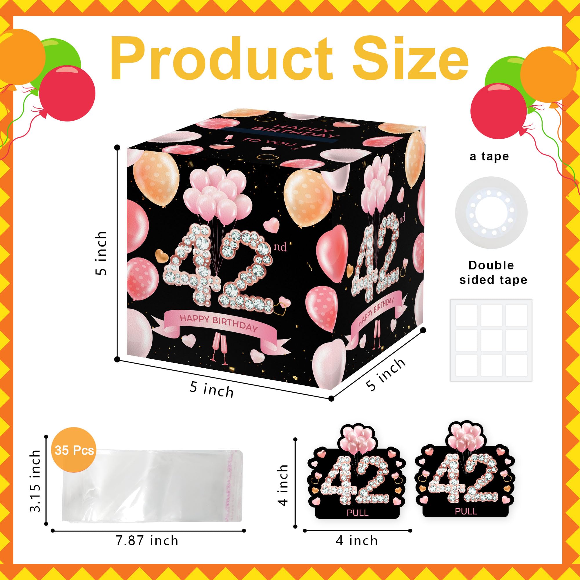 Surprise Gift Box: this gift box measures 5x5 inches, is made of durable cardboard. It also includes 2 theme-related shaped card(with adhere glue dots), 1 roll of transparent tape and 35 plastic pouches similar to the size of U.S. currency for easy placement of bills.