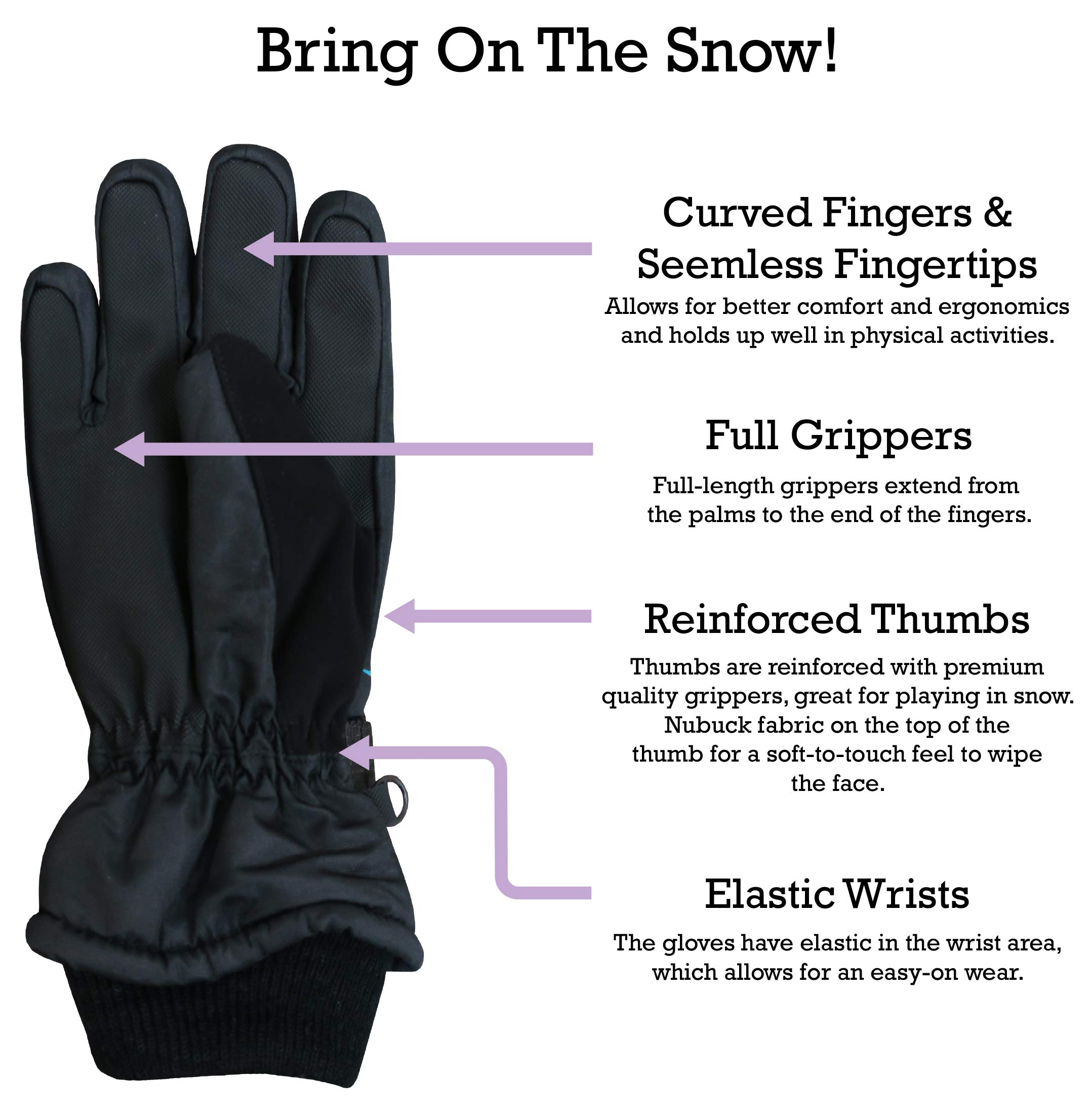 WATERPROOF, WARM AND SNOW-PROOF: The children's snow gloves are insulated with 3M Thinsulate for warmth in cold weather. The youth gloves are fully waterproof and keep hands dry in wet, snowy and icy conditions