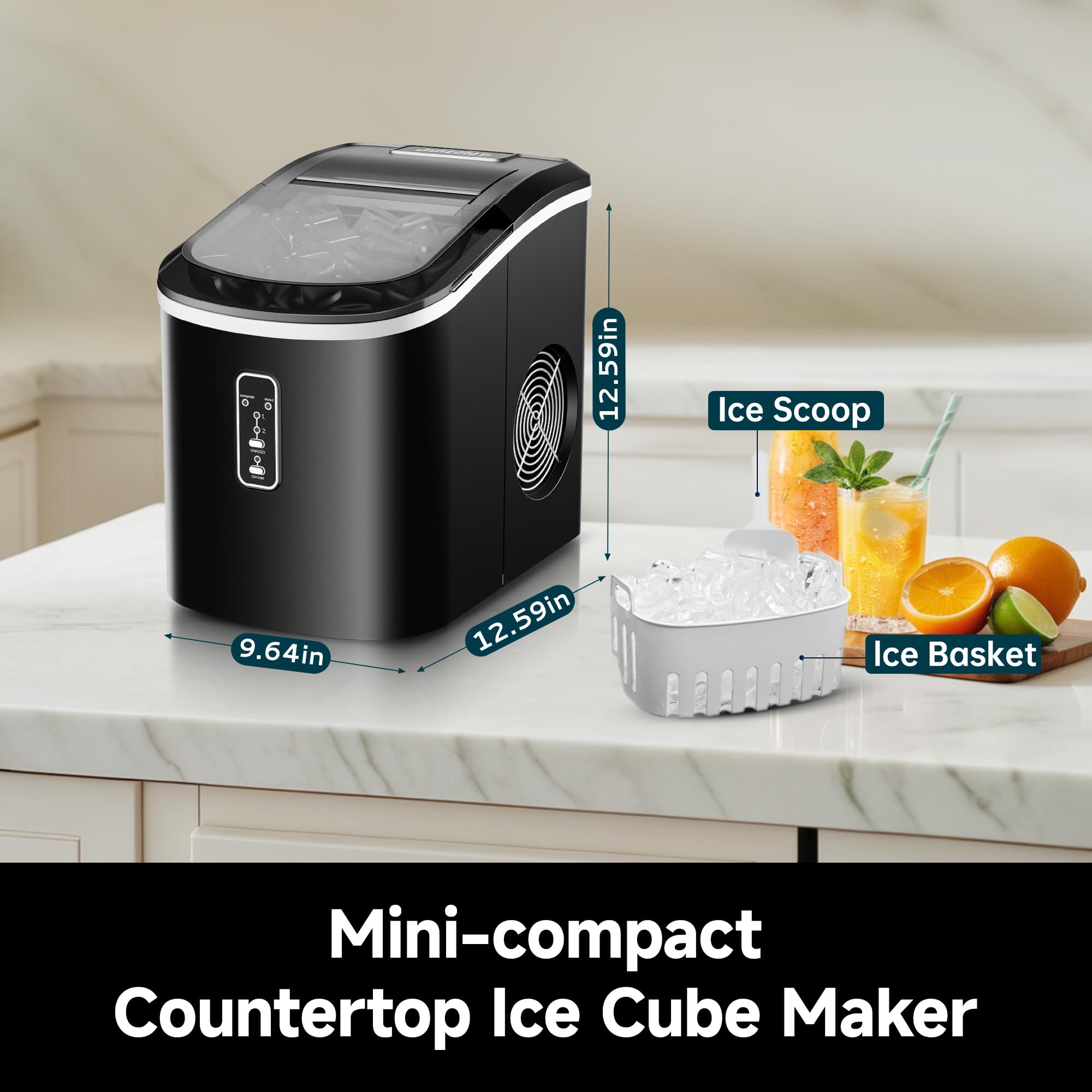 Compact Design with Complete Accessories:Designed for convenience, this lightweight ice maker (only 17.2 lbs) features a compact dimensions (9.6" L × 12.6" W × 12.6" H), making it easy to place and doesn't take up much space. Whether at home, in an RV, at a party, or while camping, it performs flawlessly. The package includes a ice basket, ice scoop, manual, and beautifully designed packaging.
