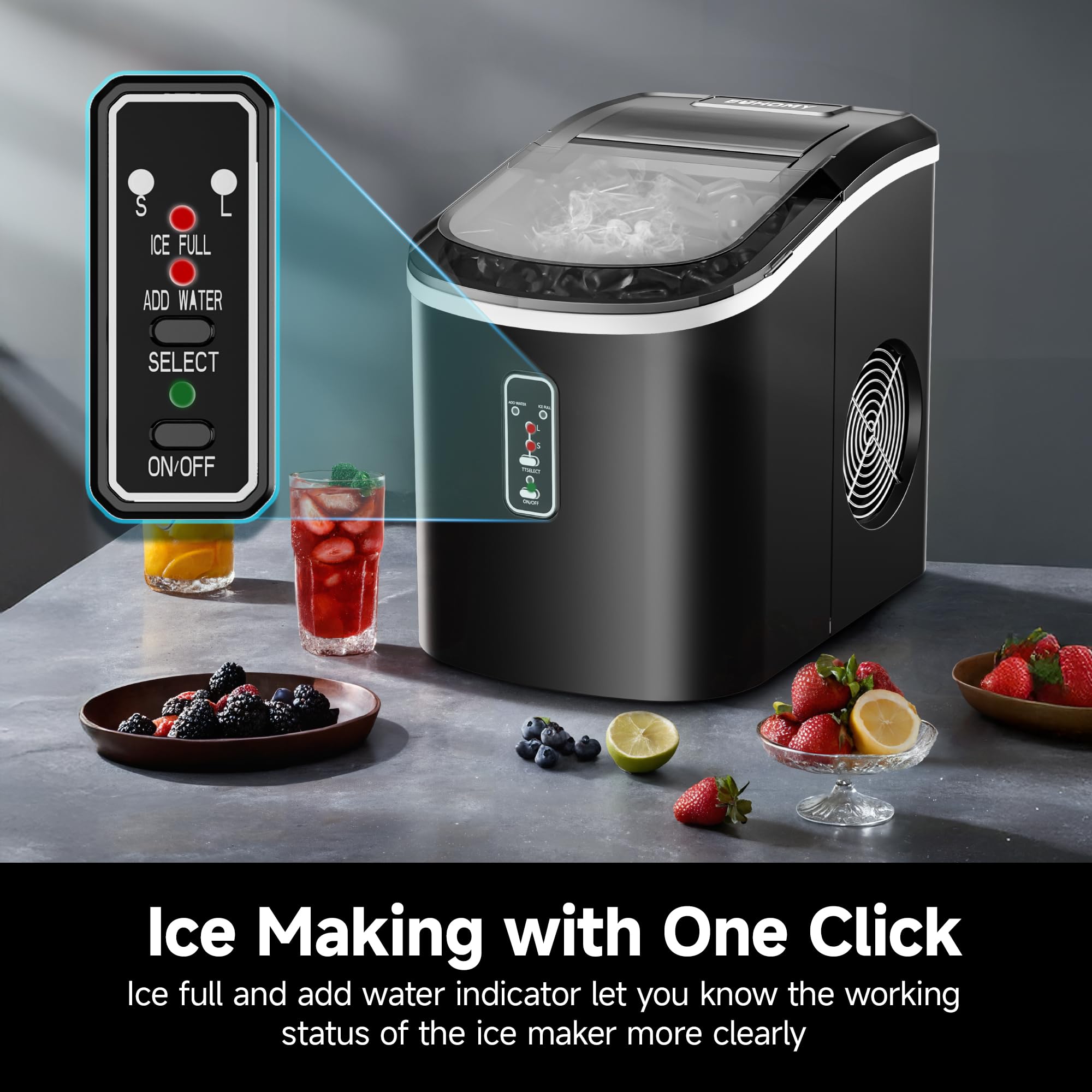 Simple Control Panel for Effortless Operation:Just add water, press ON, and select your preferred ice size. Indicator lights alert you when water is low or the ice basket is full, ensuring a hassle-free experience.
