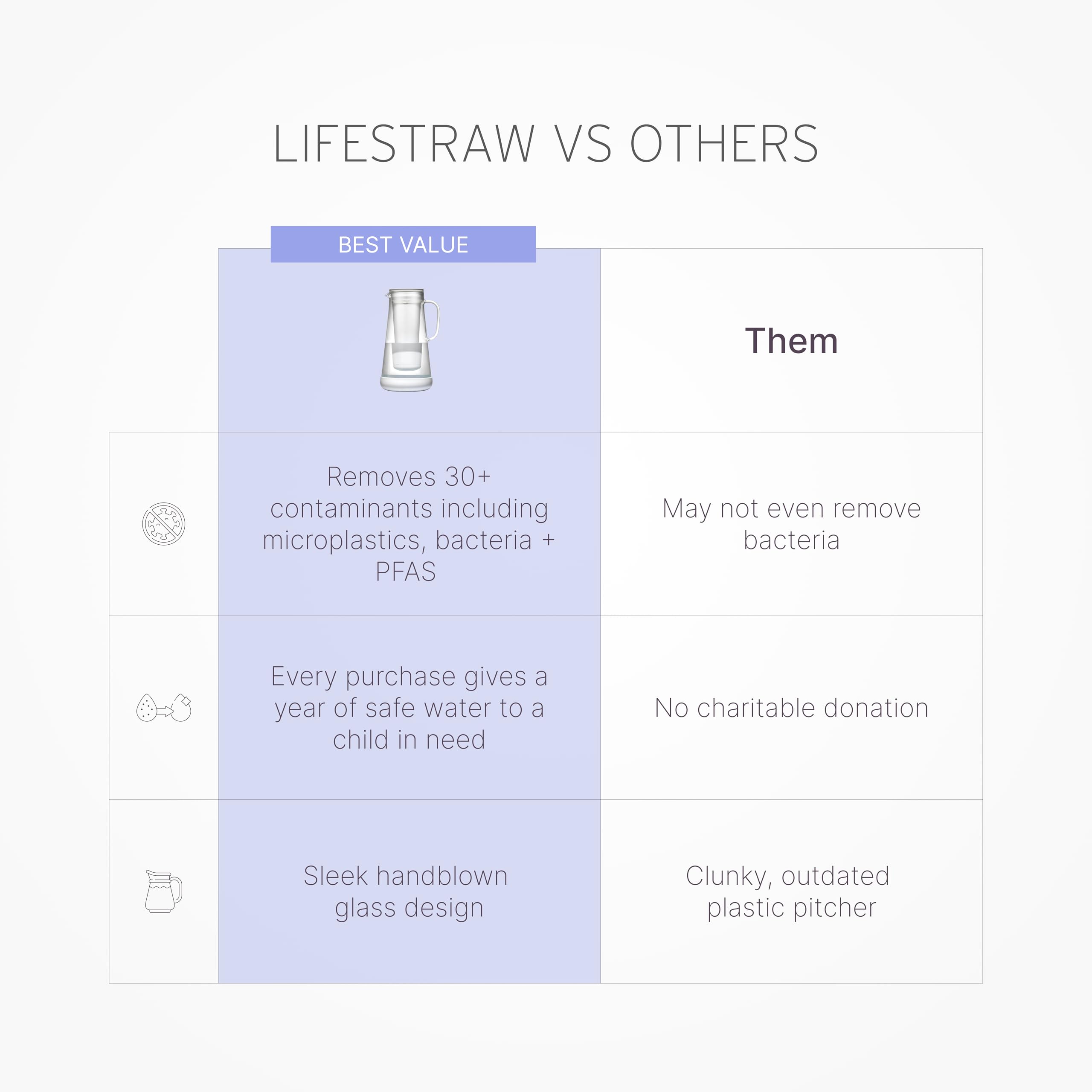 The LifeStraw Home is the only water filter pitcher that removes bacteria and parasites in addition to lead, microplastics, PFAS, and 30+ contaminants all while dramatically improving the taste of your tap water. This premium 7-cup water filter pitcher boasts a beautiful design with premium protection, all while reducing the need for plastic bottles of water. Upgrade your water filtration with this pitcher made from hand blown, borosilicate glass, now with an included silicone base! Whether youβre picking up a new hobby, refreshing your space, or focusing on nutrition and hydration, safe water that tastes good is always a good idea. Your purchase has impact: one product, one child, one year of safe water.