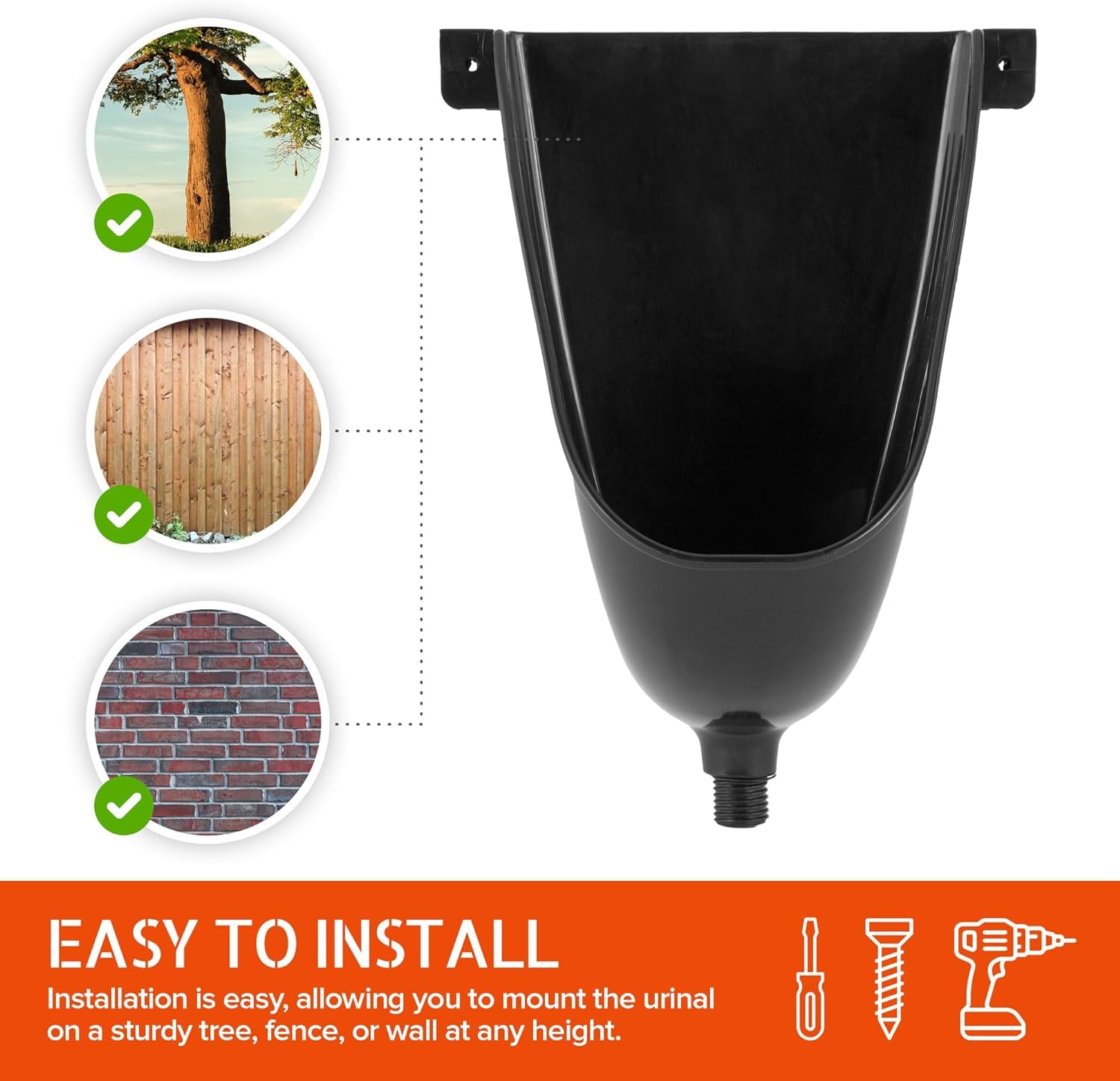 Effortless Installation: Our portable urinal can be mounted with the included screws--simply locate a sturdy tree, fence, or wall, and you're ready to go! With its adjustable height, our plastic urinal is perfect for men and boys of all ages.