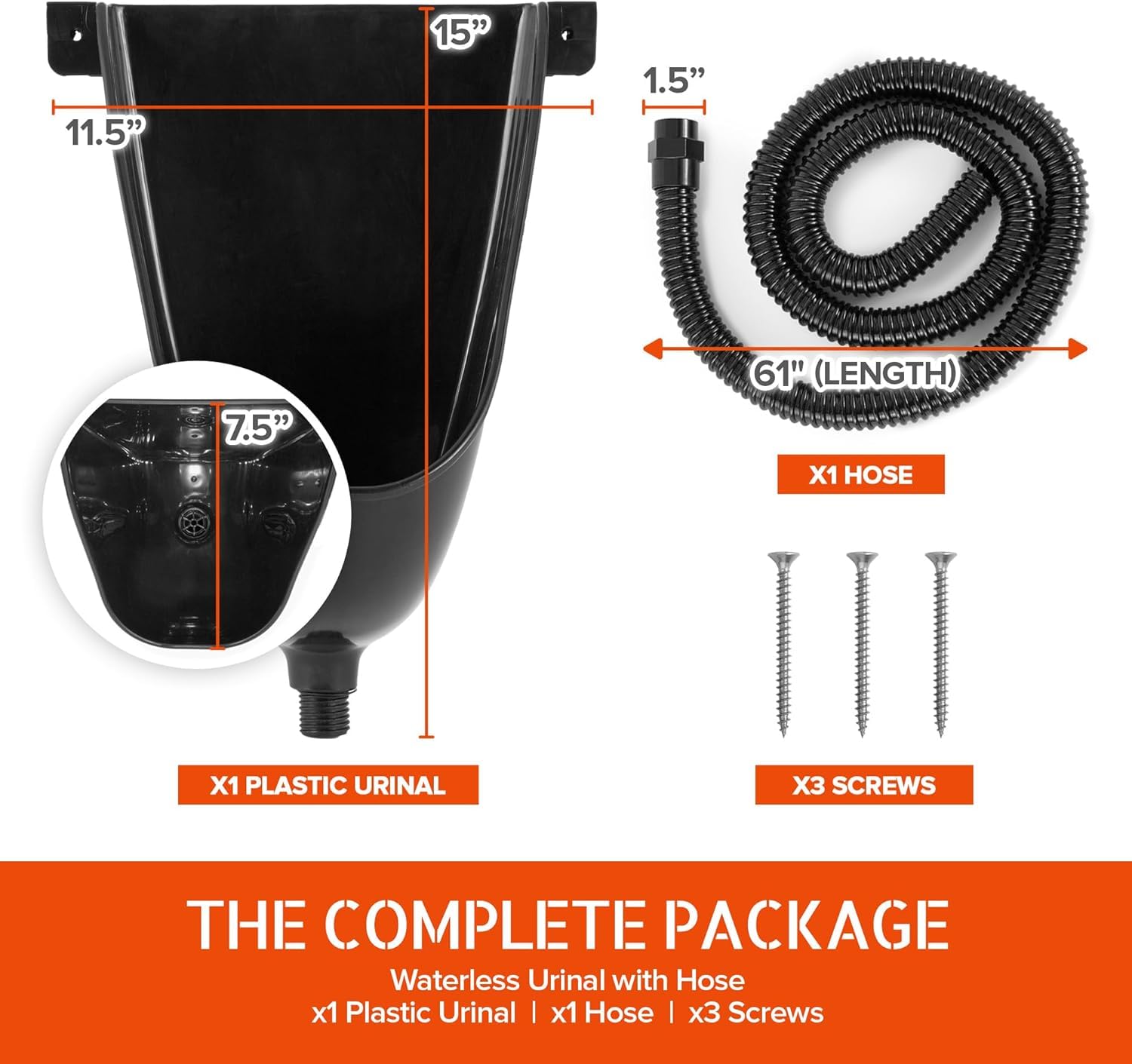 What's Included: Our waterless bathroom urinal includes 1 gray standing urinal 11.5"W x 7.5"D x 15"H, 1 black and gray hose 1.5"DIA x 61"L, and 3 wall mount screws, and can withstand indoor or outdoor installation.