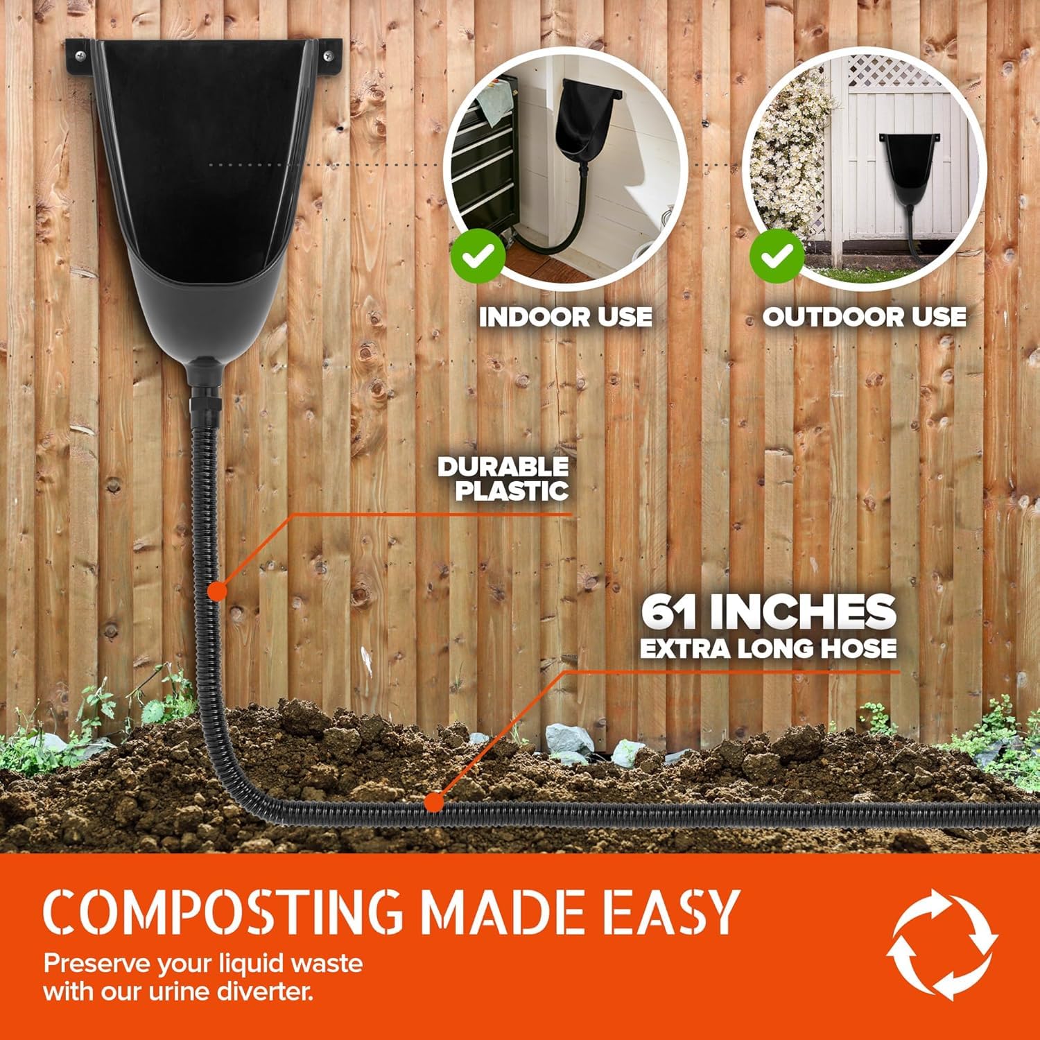Composting Toilet: Our dry urine diverter for composting toilet is the perfect solution to all your gardening needs. Simply place a small bucket or trough at the base of the outdoor urinal hose to collect your waste and add to your compost pile!
