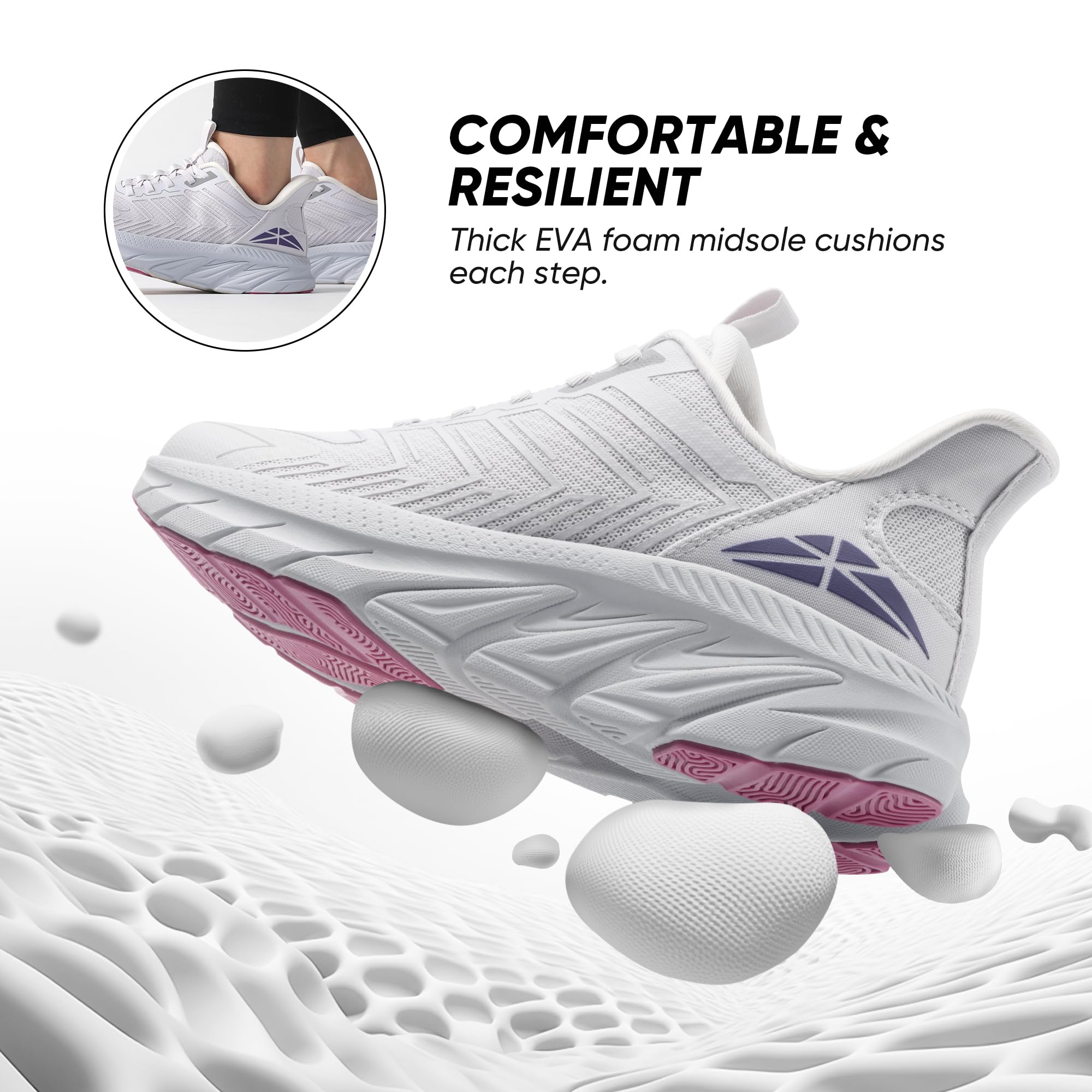 Stable & Secure: The X-shaped TPU anti-torsion plate embedded in the midsole prevents twists and potential sprains while the TPU structure of the upper wraps feet in a snug fit. Every step in these women’s fashion sneakers is confident and safe.