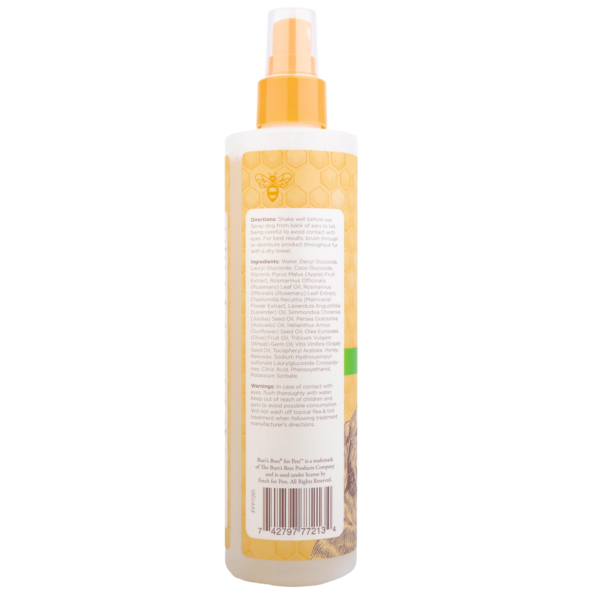Since 1984, Burt’s Bees has been working with nature to create products that nourish your skin. With the same mission in mind, we created a custom formulated range of dog shampoos to bring the same quality to the lives of our pets. Burt’s Bees™ for Pets™ Deodorizing Dog Spray leaves your pet clean while it nourishes and moisturizes their skin and coat. Leveraging the power of naturally derived ingredients, apple and rosemary clean and deodorize the coat while honey acts as a conditioner and regulates the delicate pH unique to pets, delivering a high shine finish. All our dog grooming products utilize a minimum 95%+ natural origin formulas and are formulated without chemical detergents, phthalates, parabens, or sulfates. Our dog shampoos are also formulated without added colorants and dyes. Burt’s Bees naturally derived pet grooming solutions keep pets clean and pet parents happy! Our dry dog shampoo is cruelty-free and made in the USA with global ingredients, using 80% post-consumer recycled bottles and responsible sourcing. We choose to formulate without harsh chemicals, while ensuring 95%+ natural origin formulas, pH balanced to effectively cleanse and nourish your pet. A good shake before each use is required. Directions: Shake well before use. Spray from back to head, carefully avoiding eyes and ears. *Nielsen Total Pet Plus Stores Pet Grooming Shampoo/Conditioner L52 W/E 10-11-25