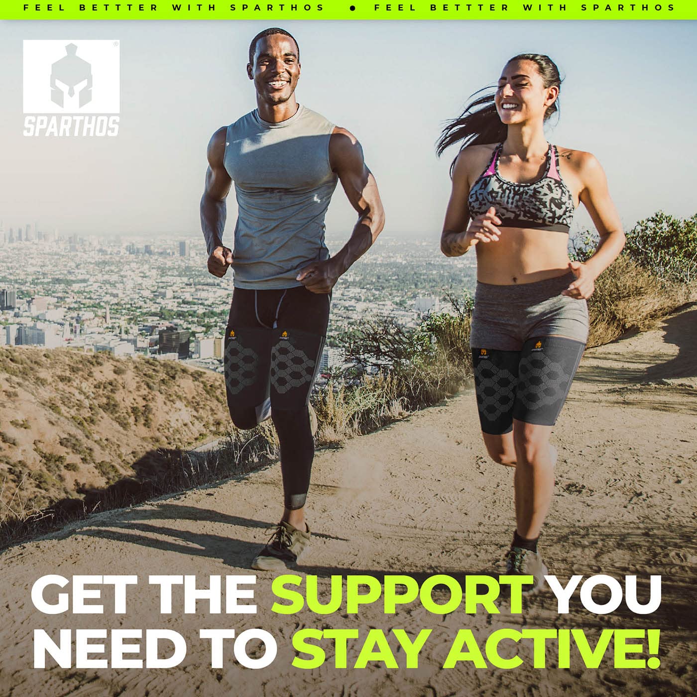 ✅ YOU DESERVE THE BEST - Tight and discreet Sparthos thigh sleeve fits like a second skin. Crafted from top quality breathable yarn, with silicon strips to keep the sleeve just in the right place. No slipping or rolling off. Are you ready to leap ahead into a life full of motion?