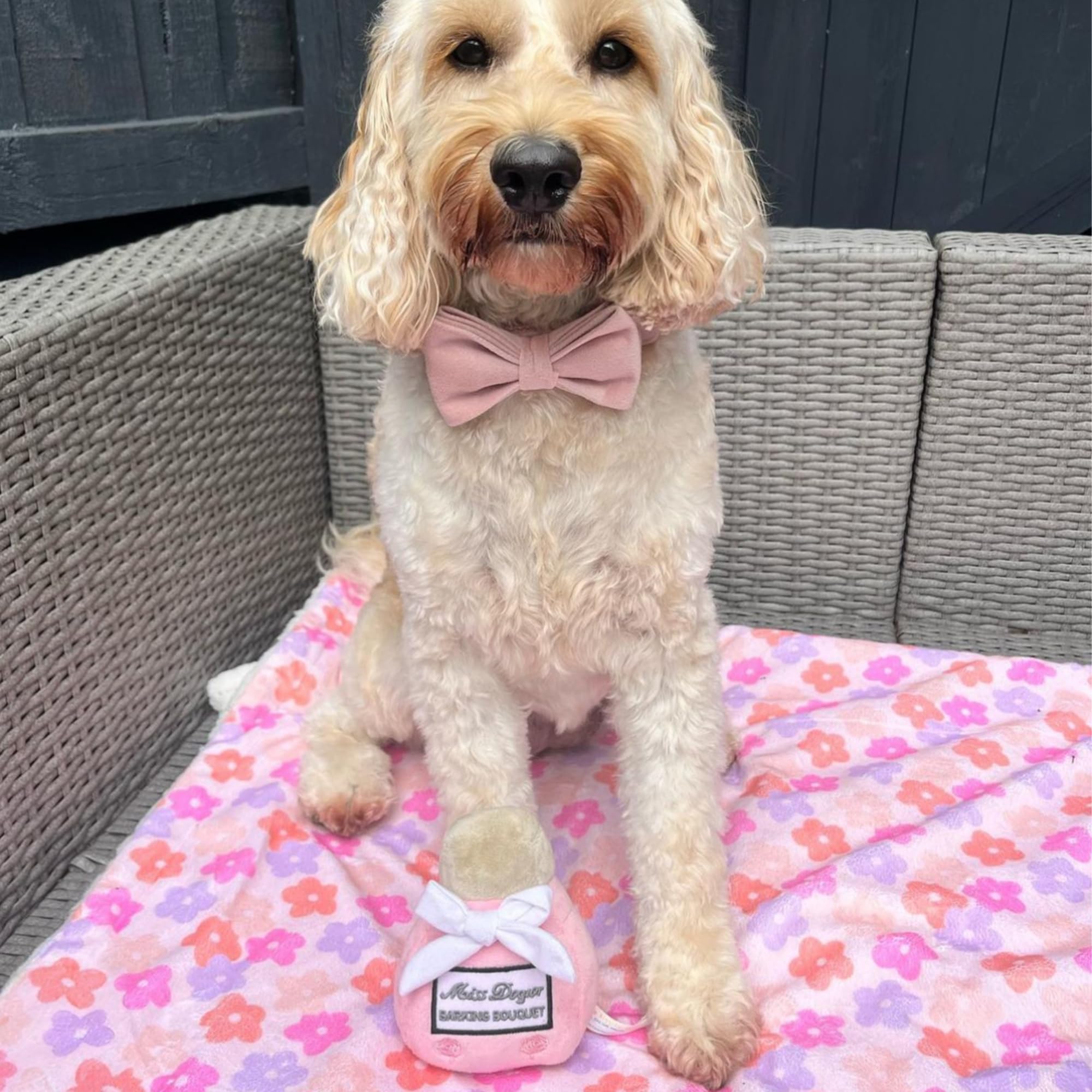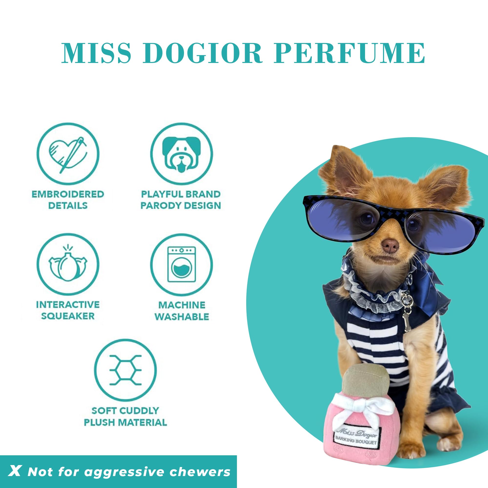 Funny Parody Plush Dog Toy: Have your pup smelling like roses with our Miss Dogior Perfume Bottle dog toy, that features a stylish light pink plush exterior with a built-in squeaker hidden inside. It’s a playful, cute interactive dog toy that combines style & fun. One Size 5"x5"x1.5".