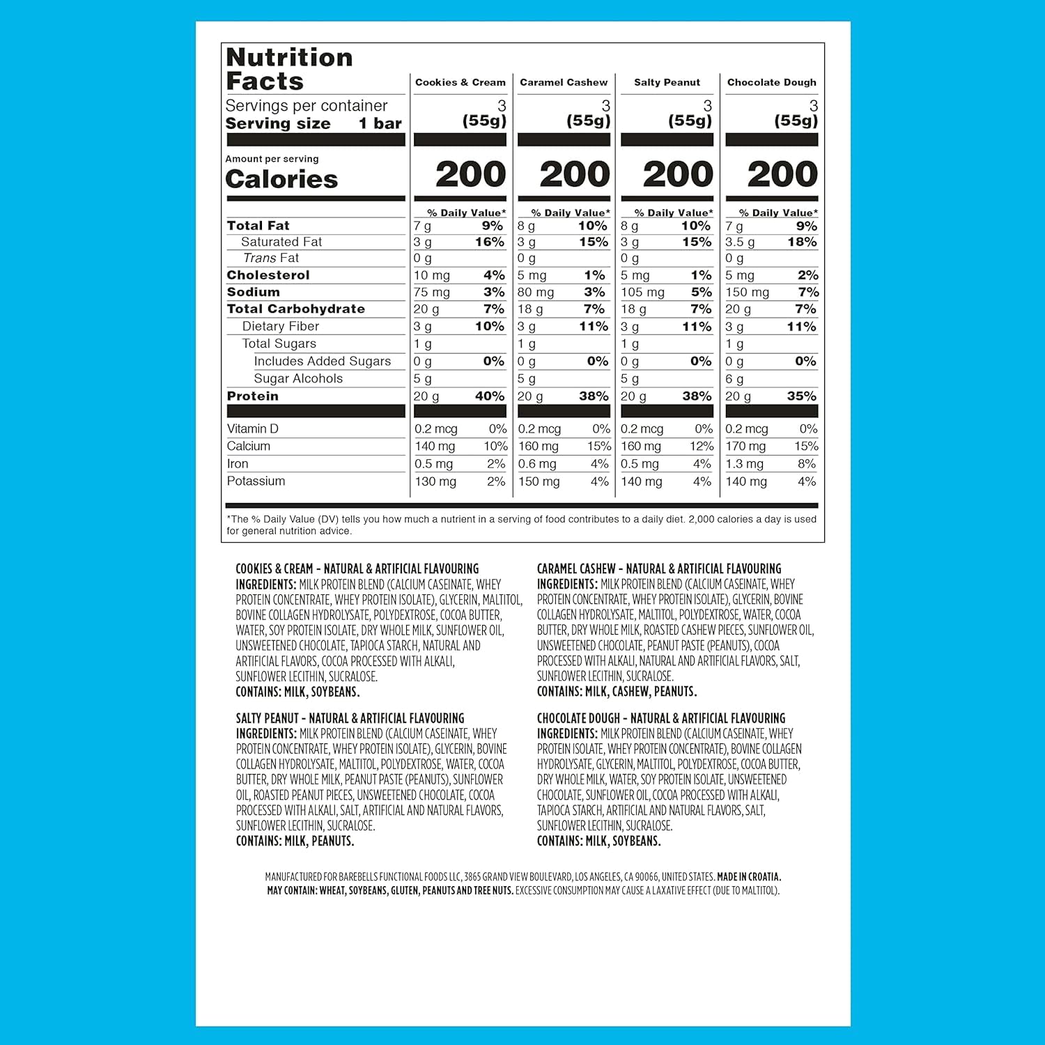 BAREBELLS VARIETY PACK PROTEIN BARS - 12 individual yummy Barebells protein bars! Tired of eating bars that taste like cardboard? Our protein bar variety pack is a delicious mix of some of our fan favorite flavors, all with 20 grams of protein – (3) Cookies & Cream, (3) Caramel Cashew, (3) Salty Peanut, and (3) Chocolate Dough.