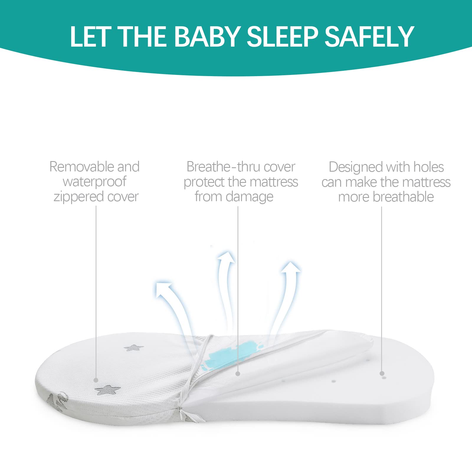 Removable and Waterproof Zippered Cover: Removable soft OEKO-TEX standard 100 certified cover with cute star print and TPU waterproof layer that can be washable and extremely soft to the touch for your baby, you never have to worry about accidents and keeping your bassinet mattress pad clean.