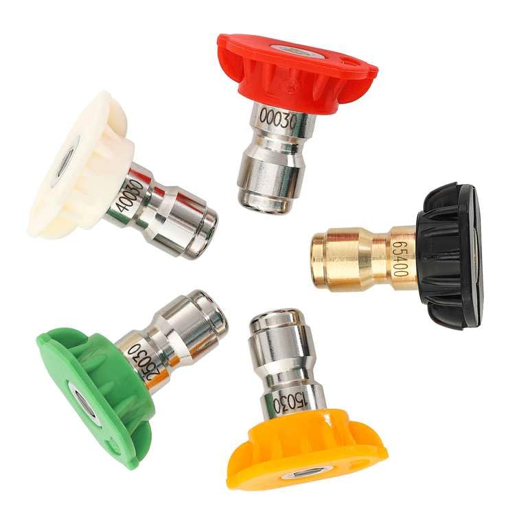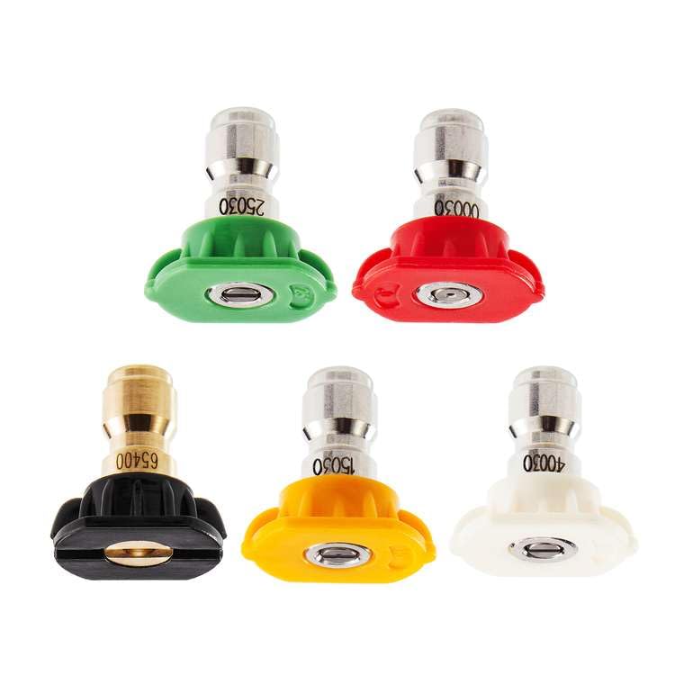 Nozzle Tips set includes: 1 Red Stainless Steel Nozzle Tip (0 Degree), 1 Yellow Stainless Steel Nozzle Tip (15 Degree), 1 Green Stainless Steel Nozzle Tip (25 Degree), 1 White Stainless Steel Nozzle Tip (40 Degree), 1 Brass soap nozzle tip (65 Degree). Choose different angles nozzle according to the actual need