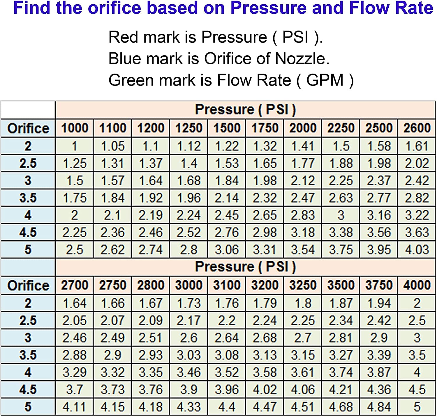 NOTE: Please see Image 2 and find the orifice you need based on working pressure and flow rate (GPM). The orifice of these nozzles are 3.0. The working pressure is up to 4000 PSI.