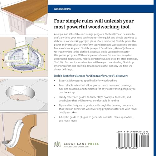 With SketchUp Success for Woodworkers, any woodworker can download SketchUp and be drawing helpful, detailed woodworking plans like a pro in no time at all. An affordable, simple, and powerful 3-D design program, SketchUp can be used to create models and plans for anything a creative mind can imagine, especially simple to elaborate woodworking projects and plans. After many years of using SketchUp, David Heim, an expert woodworker and writer, has developed a simple set of rules for success that will guide you in mastering this potent program. With SketchUp Success for Woodworkers, any woodworker can download SketchUp at breakfast and be drawing detailed and useful plans by dinnertime. Easy-to-understand instructions, screen shots, and step-by-step projects make it easy to unleash the valuable benefits of SketchUp to create the models and plans that will transform your woodworking design process and elevate your woodworking output.