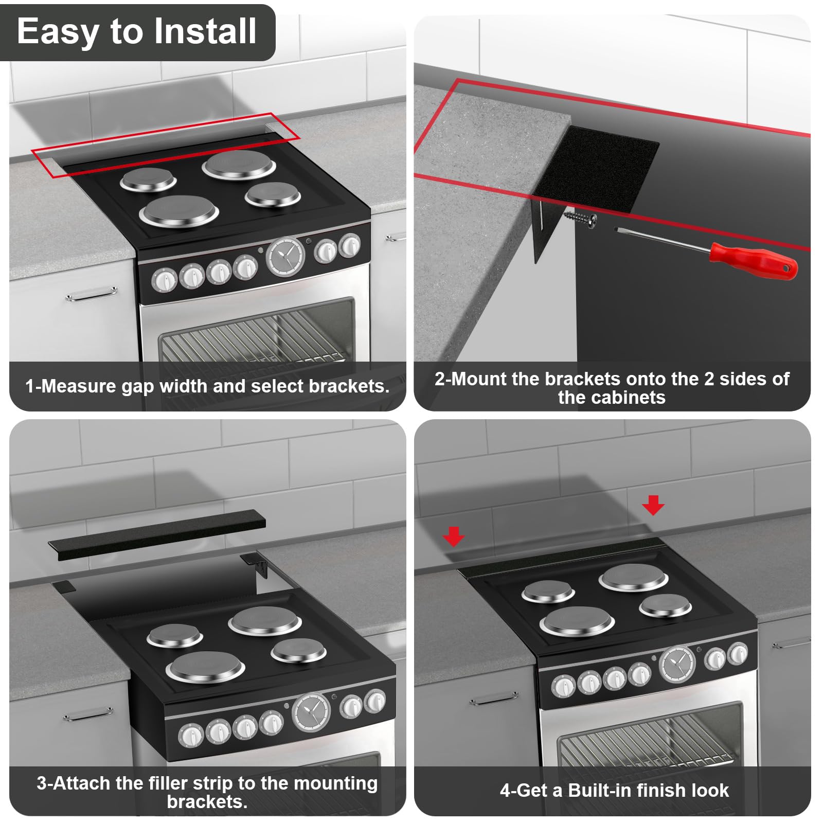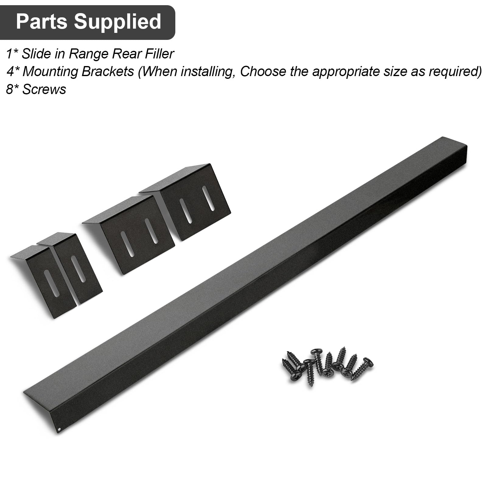 Easy to Install: The Installation of the slide-in range rear filler kit will require no disassembly of the appliance or repair experience. You can have a perfect solution in just 10 minutes. Equipped with the two fixing brackets, the rear filler strip is very stable and safe. ( Please ensure the range is level prior to installation.)