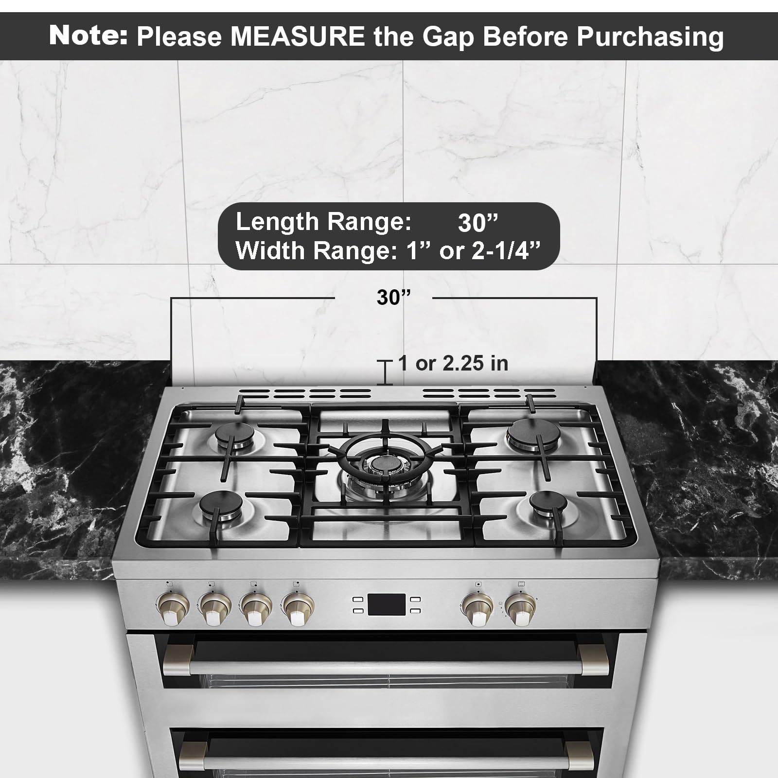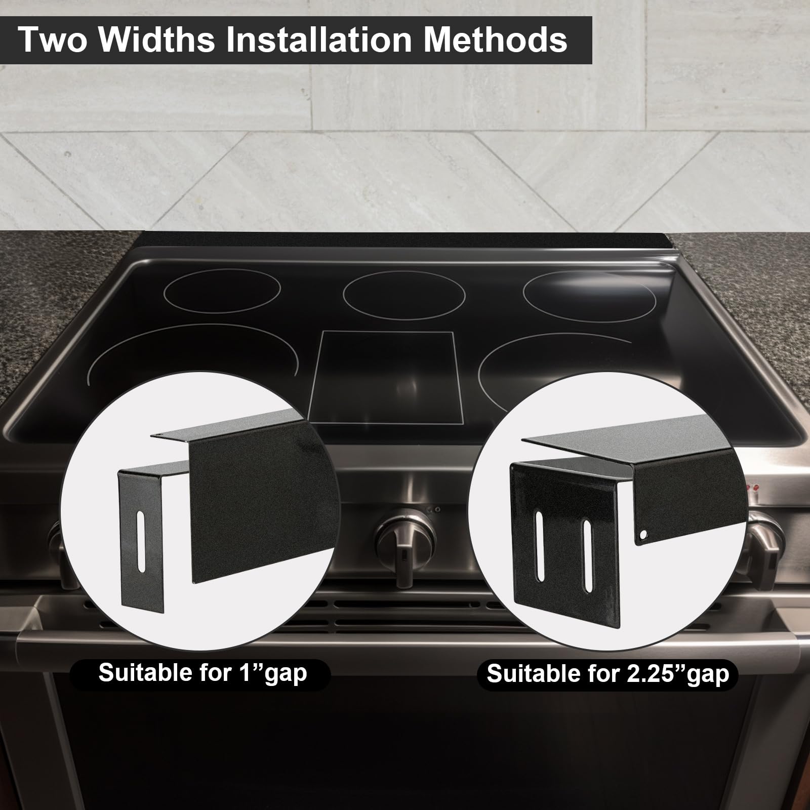 2 Different Widths: These stainless steel stove gap covers are suitable for gaps measuring 30" Long and 1" or 2.25" wide between the stove and wall/cabinet. The design of two different widths allows you to be more flexible when filling gaps. You can choose the appropriate 2-1/4" or 1" stove gap bracket according to your needs, making it more convenient for you to install.