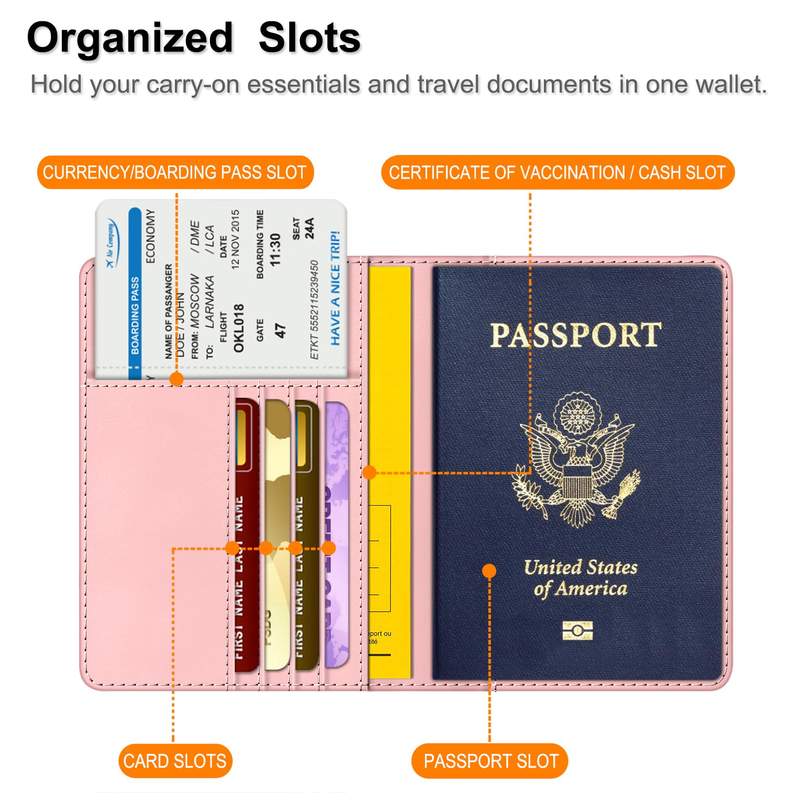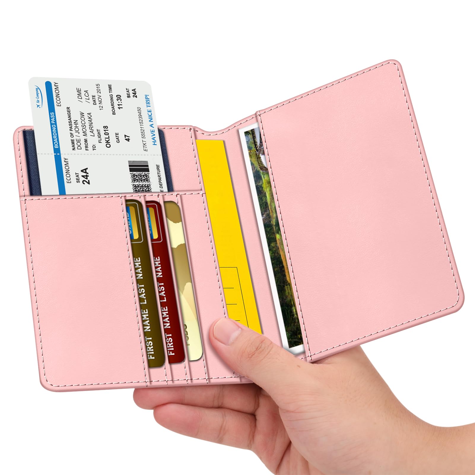 Big Capacity: The passport holder is equipped with practical slots that are designed to hold your passport, business cards, credit cards, and boarding passes efficiently. This enables convenient access to important information during the boarding process and while in transit, keeping everything organized in one place.