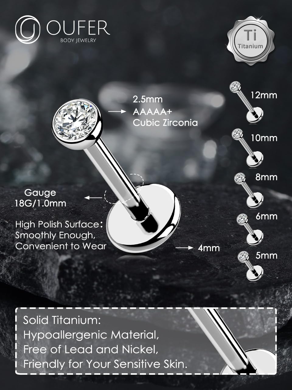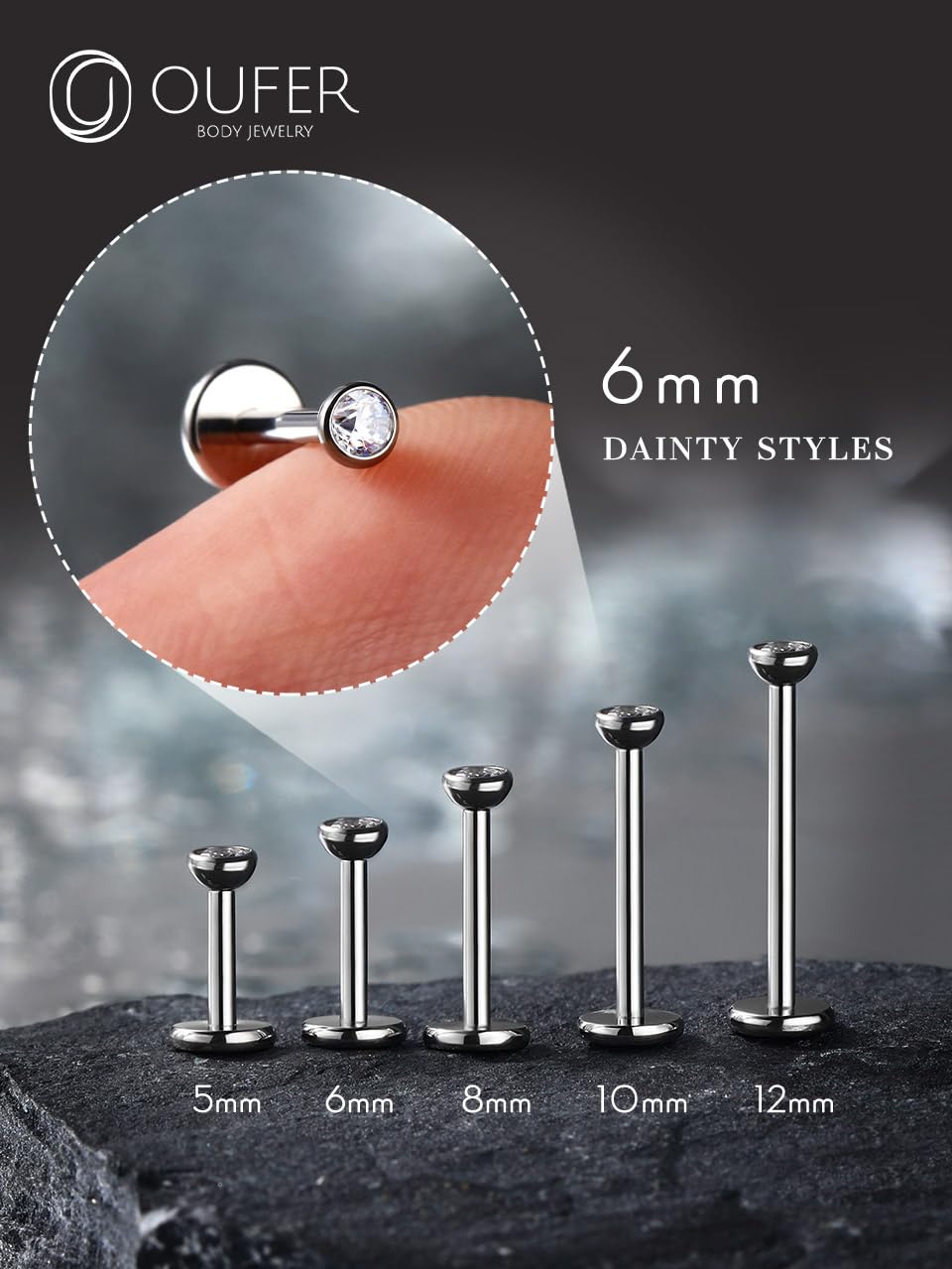 【Standard Nose Studs Size】: Gauge = 18g(1.0mm), bar length = 6mm(15/64''), diameter of CZ = 2.5mm. The flat back studs are normal and standard size for nose helix tragus labret piercing jewelry.