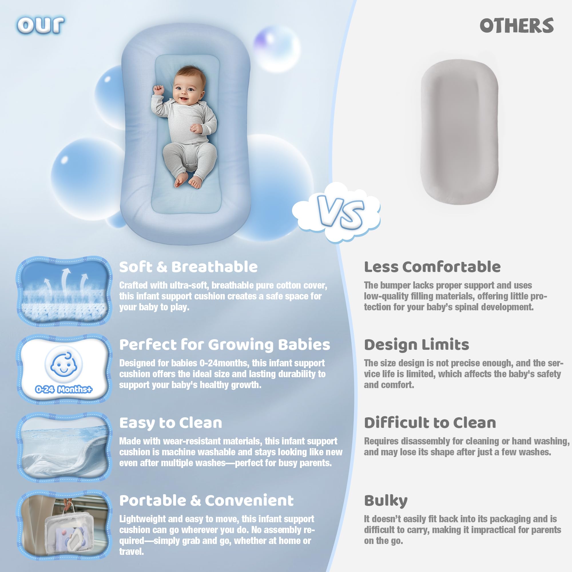 Supporting Your Baby’s Growth and Comfort: This infant support cushion features a soft, supportive bumper and 3D polyester fiber filling that gently supports your baby’s back, promoting healthy spinal development. Whether your little one is enjoying supervised tummy time, awake play, or learning to sit, the support cushion provides gentle, comforting assistance