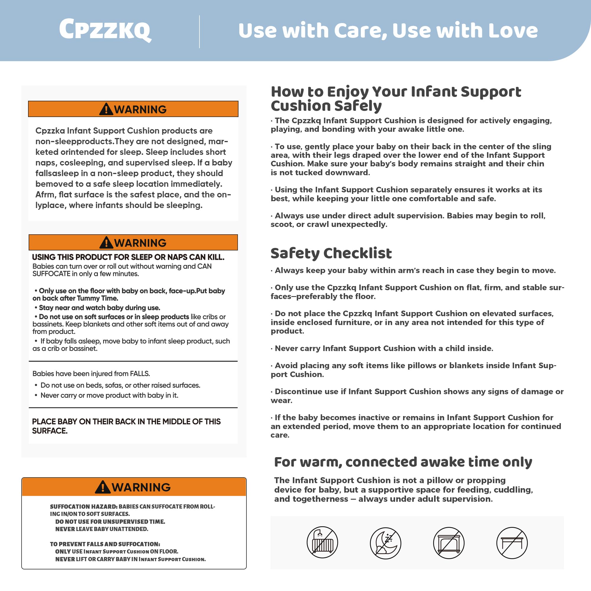 Important Safety Reminder: Create precious moments with your awake little one during playtime, bonding, or story time—this infant support cushion is designed exclusively for supervised awake time, ensuring comfort and safety. Always supervise your baby when using this product. Not intended for sleeping