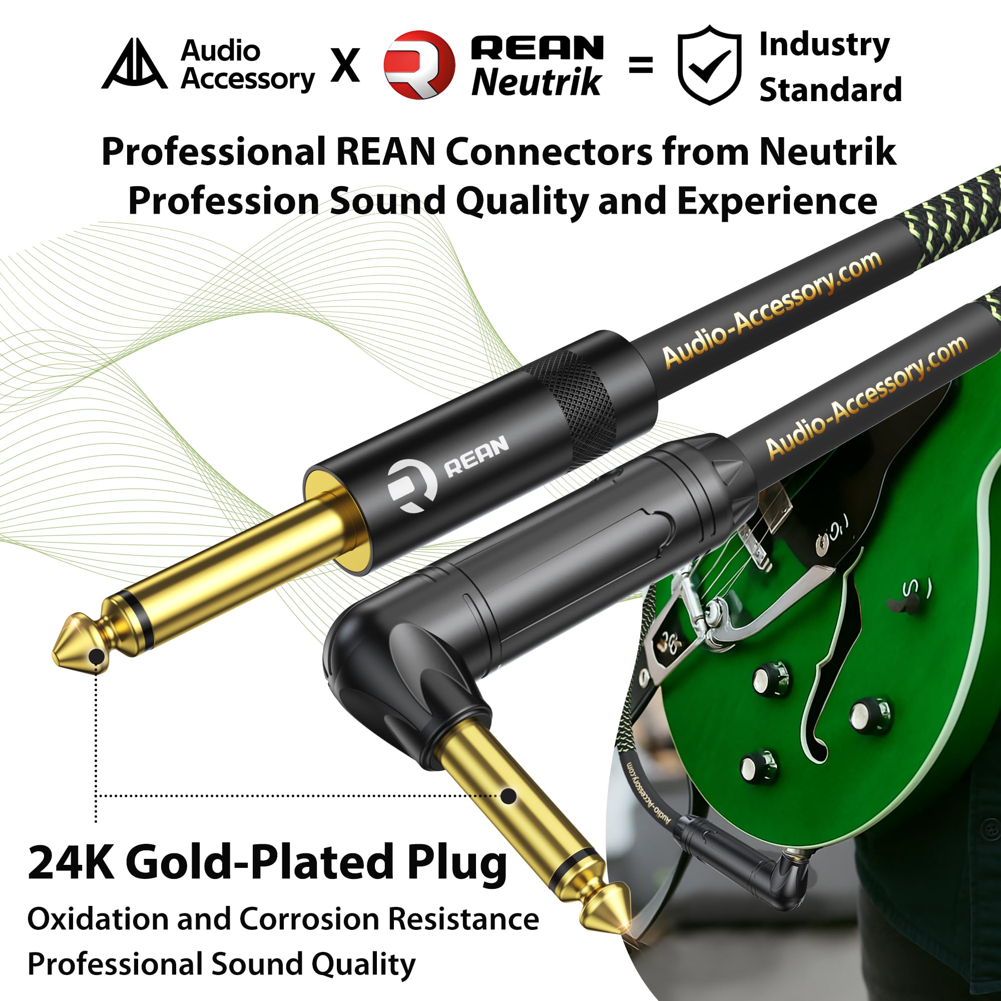 [Gold-Plated Rean Connectors by Neutrik] AA AUDIO ACCESSORY Pro Series guitar cable 20 ft is built with GOLD-PLATED Rean connectors from Neutrik (NYS201DBG), ensuring consistent, pro-level performance you can rely on.