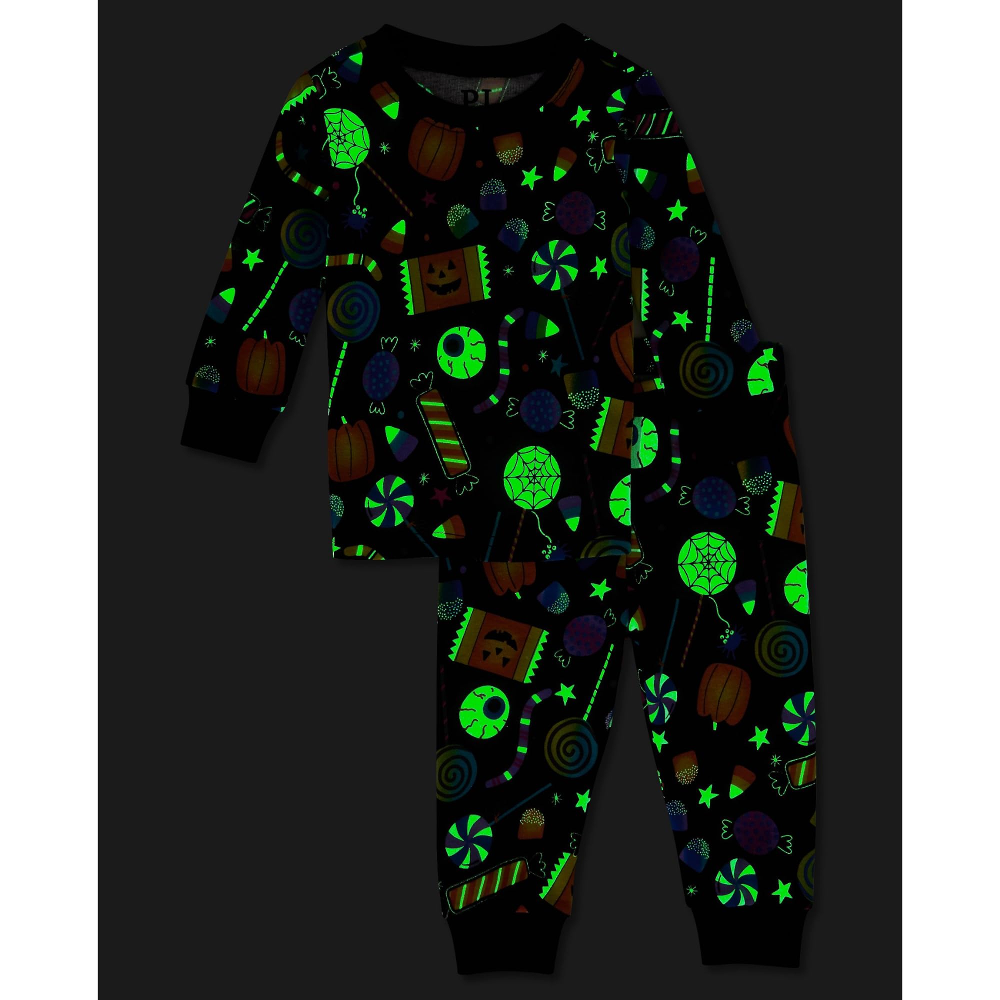 PAJAMA PANTS: Pull-on elasticized waistband, banded leg cuffs, glow in the dark Halloween candy print; For best glow effect, expose to light before wearing.