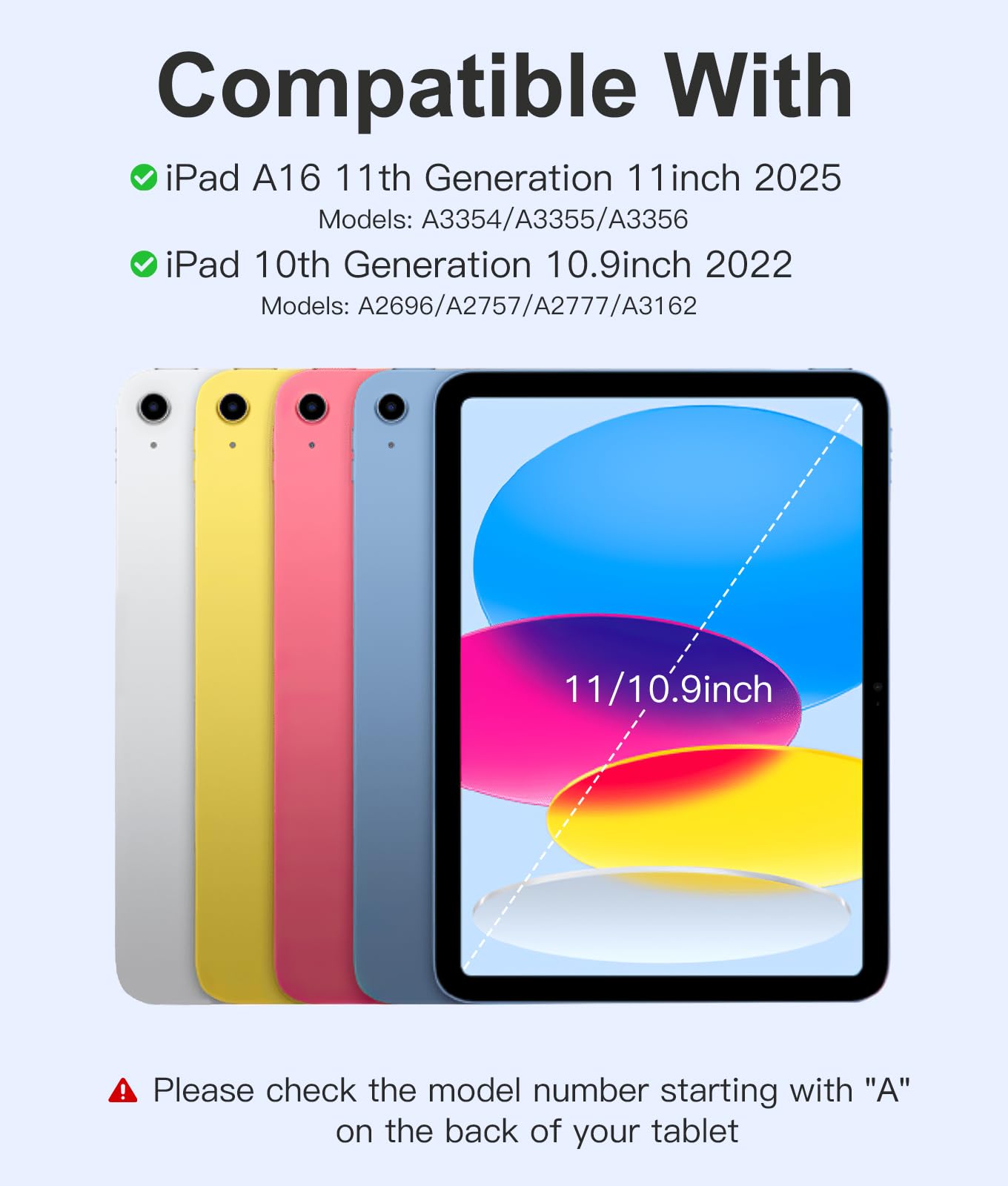 For iPad 10th Generation Case with Keyboard 10.9 Inch: This keyboard case compatible with iPad A16 11th Generation 11-inch 2025(Model: A3354, A3355, A3356), compatible with iPad 10th Generation 10.9 inch 2022(Model: A2696, A2757, A2777, A3162). Not compatible with any other models. Please check the model number starting with "A" on the back of your tablet before purchasing