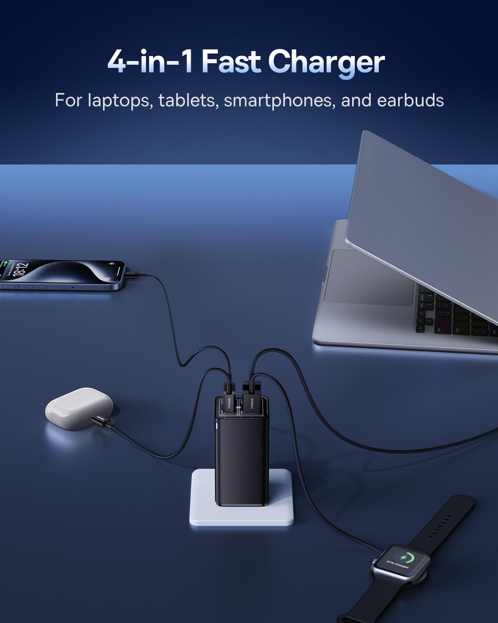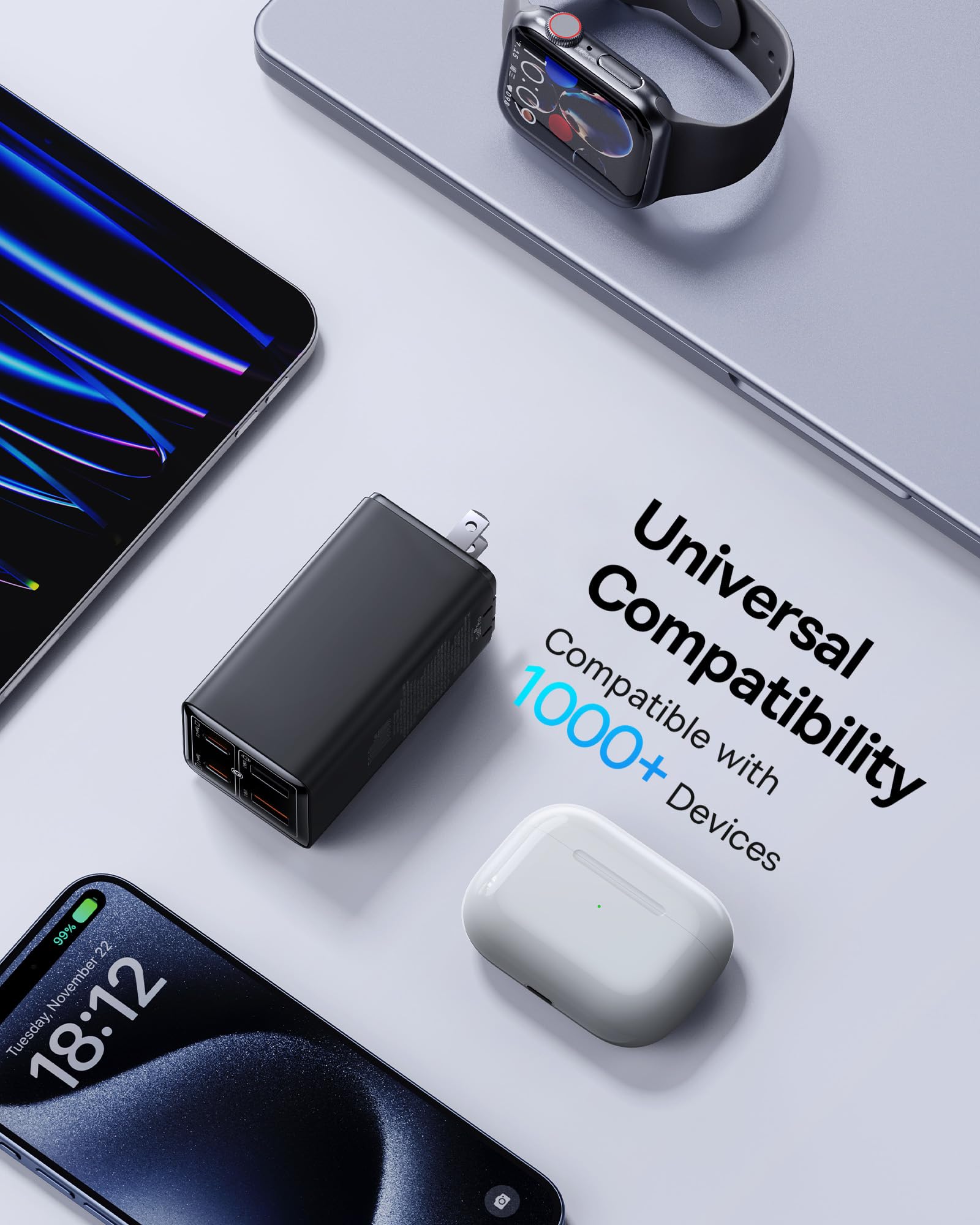 4-in-1 Smart Fast Charging: With 2 USB-C ports and 2 USB A ports, this 100W usb c wall charger can effortlessly and intelligently charge your smartphone, tablet, notebook, earbuds or smartwatch simultaneously.
