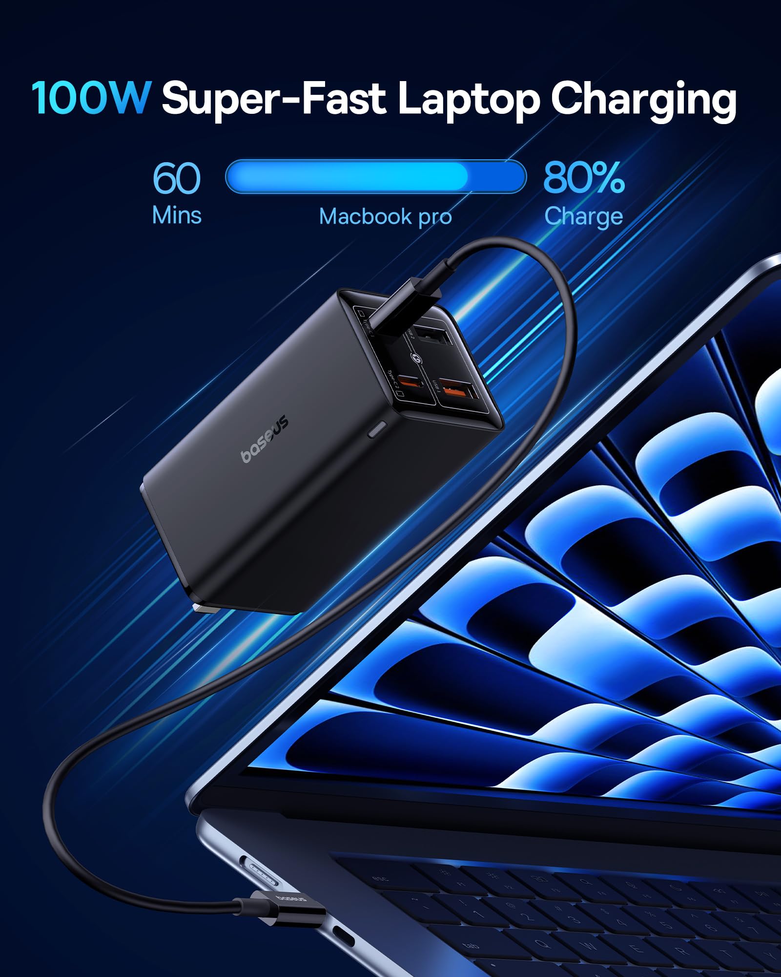 100W Max Charging for Laptops: Both USB C ports can deliver a maximum output of 100W when used alone. With this 100W usb c charger, you can charge a MacBook Pro from 0%-80% in an hour.