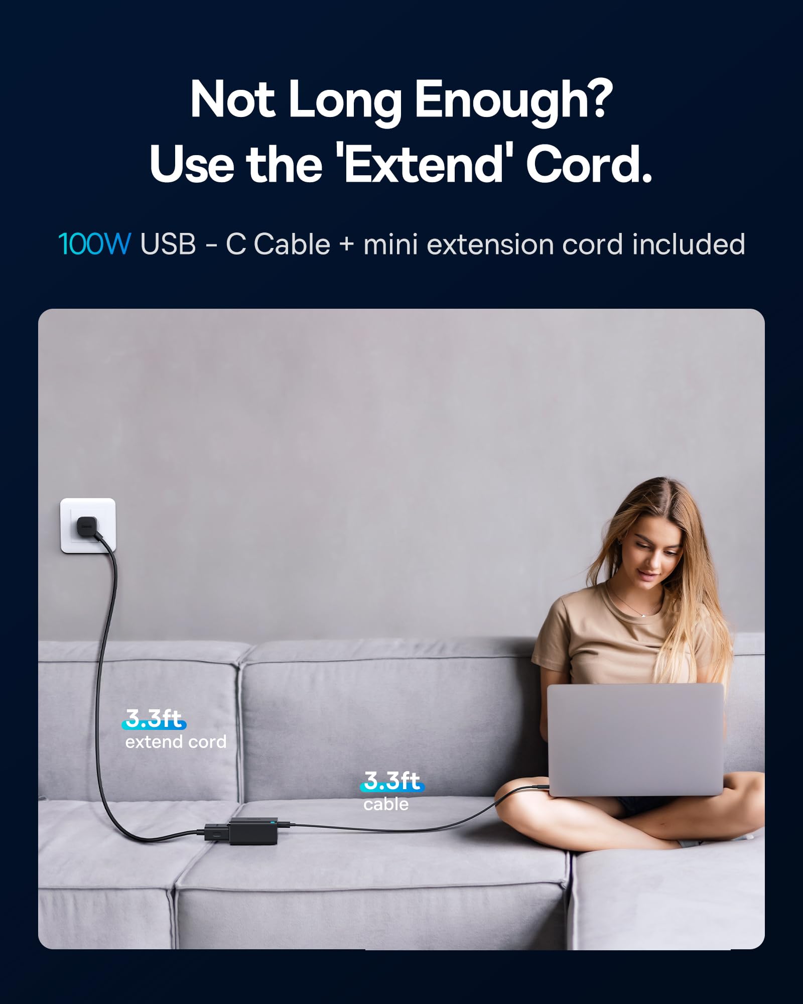 Added 3.3ft Extension Cord for Better User Experience: The usb c charger comes with a 3.3 ft extension cord, you can use it to increase charging distance and avoid the situation of wall charger falling out of the socket at the same time.