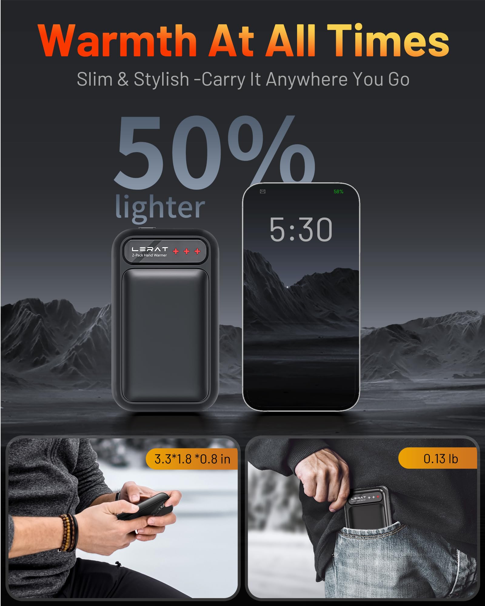 【Easy To Carry】 The rechargeable hand warmers are super slim and lightweight, measuring 3.26 inches and weighing only 0.18lb—just 30% of the weight of traditional models. The hand warmers are easy to carry and fits effortlessly into your pocket. Plus, it can be discreetly placed in hats, gloves, clothing, and tights for warmth wherever you need it.