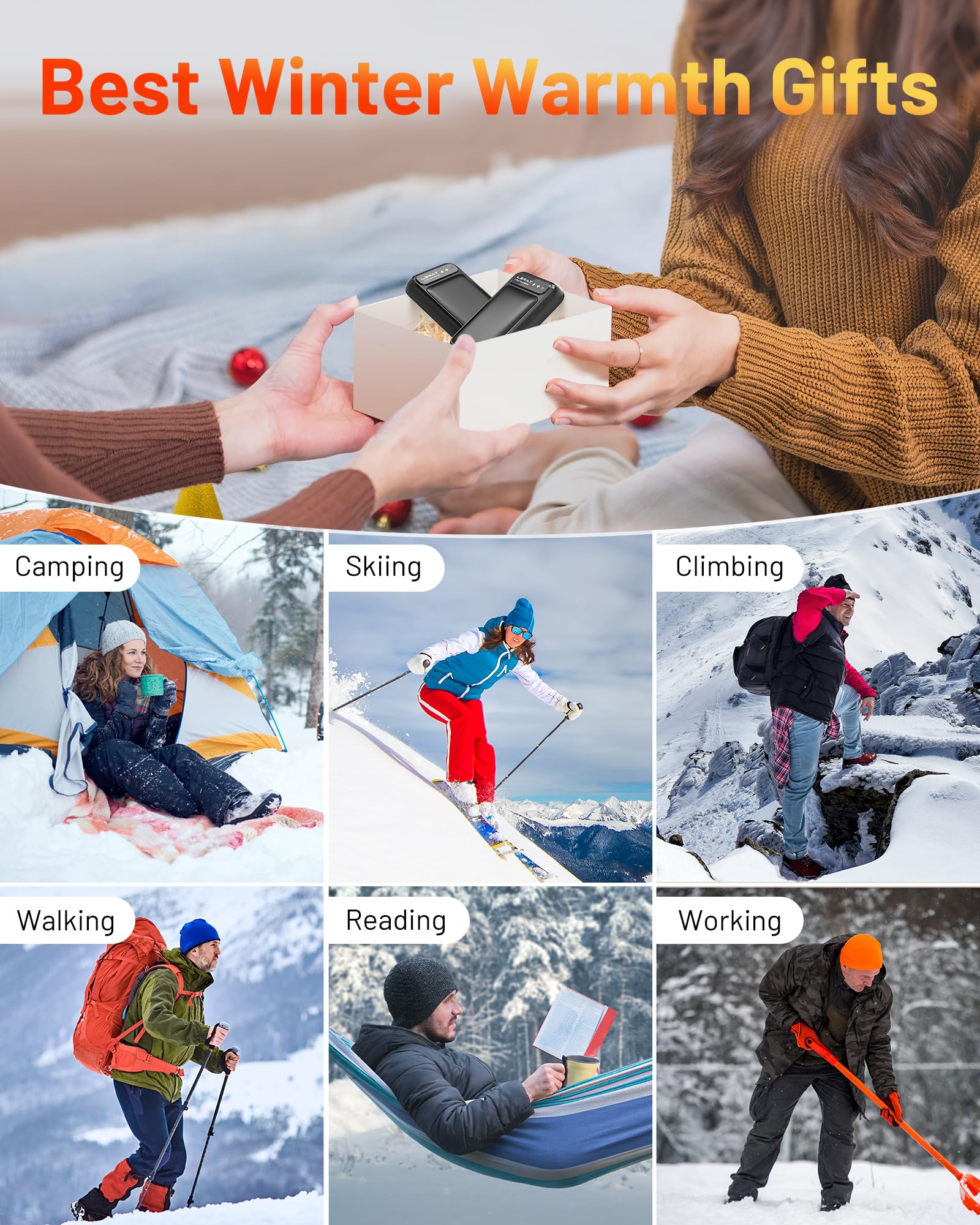 【Versatile Uses For Any Cold Day】 Whether you are enjoying sports outdoors in the cold winter, or enjoying family gatherings/cozy nights by the fireplace, or taking a winter stroll, These compact and powerful electric hand warmers will make sure your hands stay warm. Say goodbye to the discomfort of cold hands!