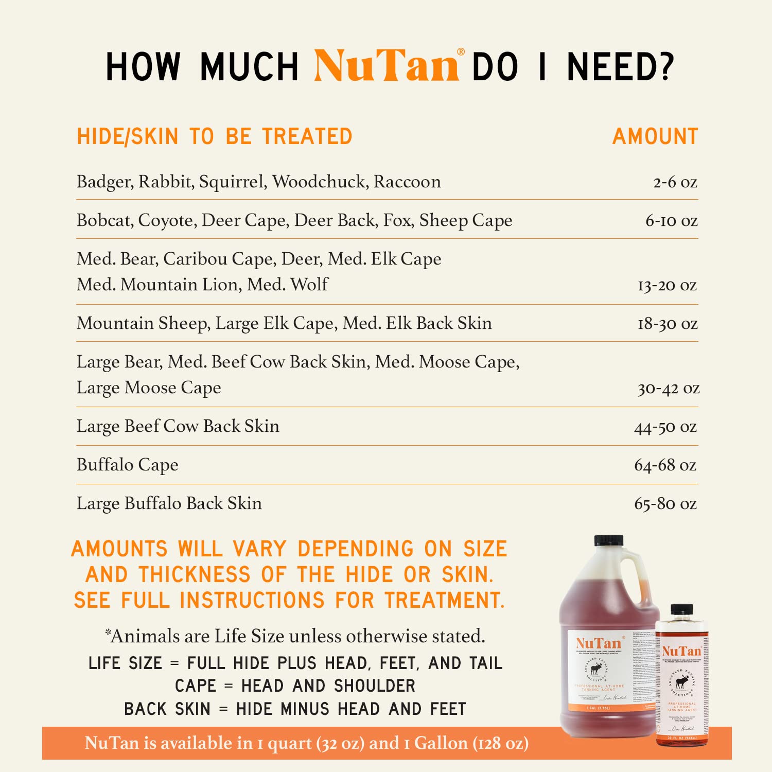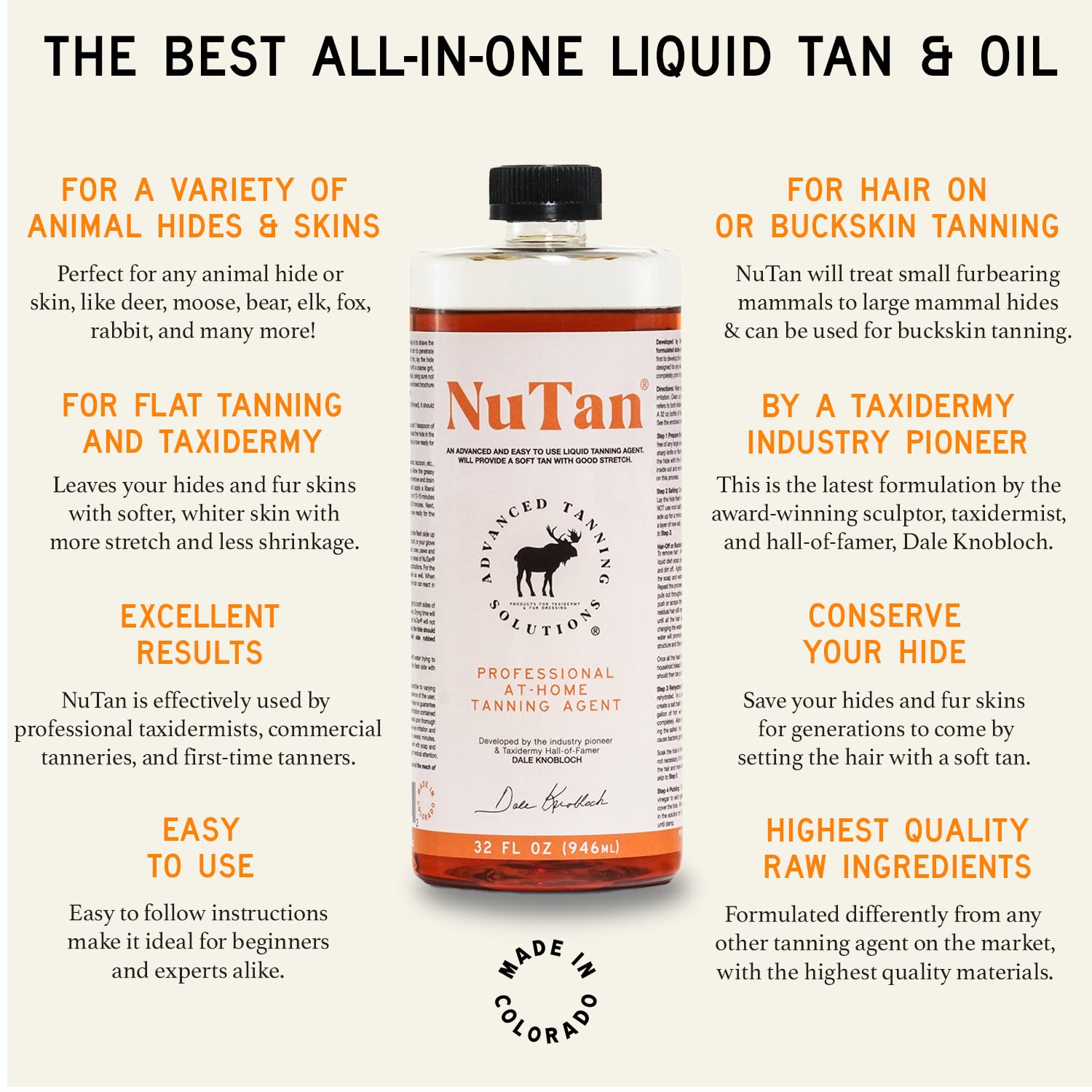 Versatile All-in-One Tanning Solution: Formulated by industry pioneer Dale Knobloch, NuTan tans and oils hides and skins in one step—perfect for deer, moose, bear, elk, fox, rabbit, and more—delivering professional-grade results for hunters and taxidermists alike. No complicated processes or extra products needed.