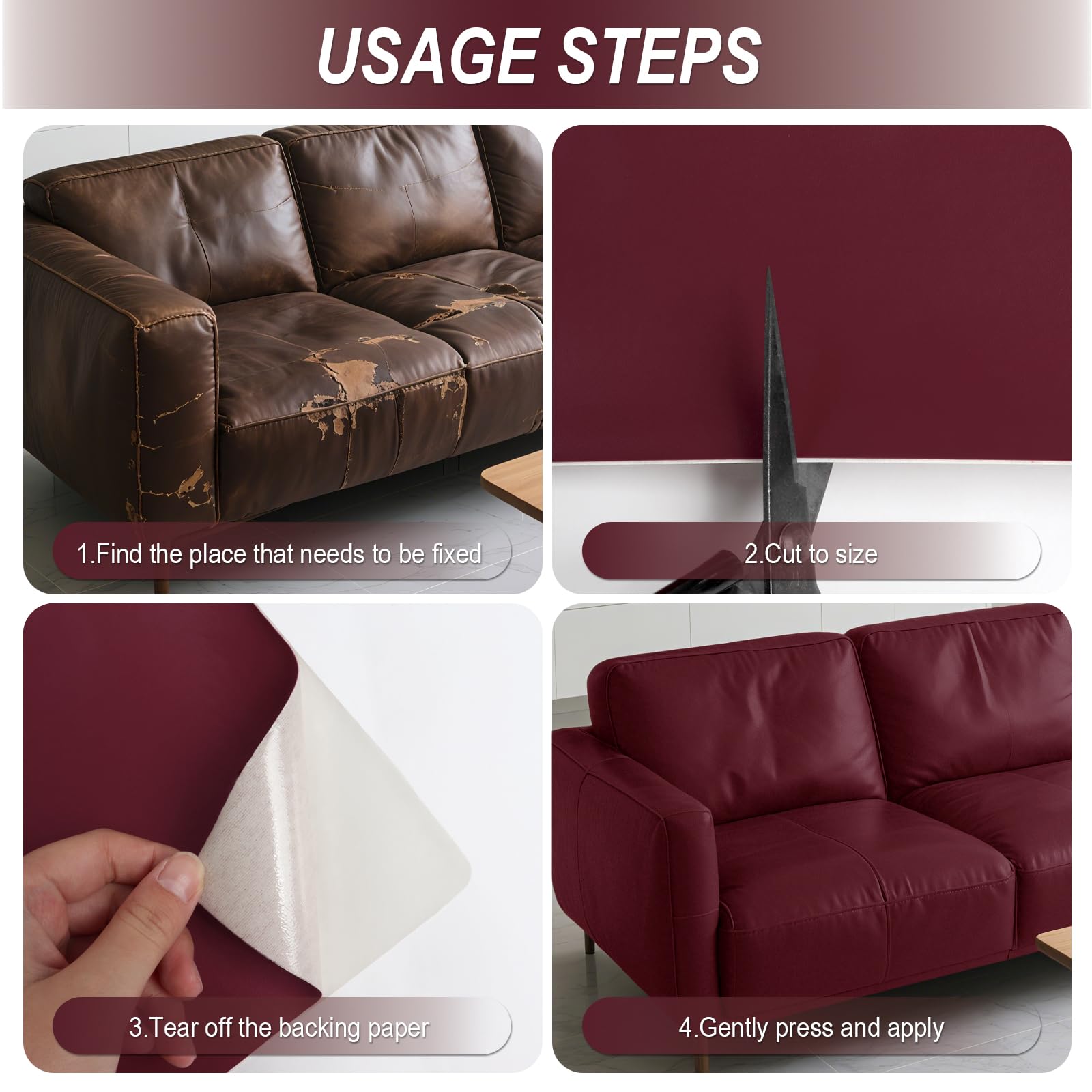 Magical Repairing and Wide Applicability: Adhesive leather repair tape can be used for tears, rips, cover or patch concealment the object that made from leather, vinyl and many other upholstery fabrics. Such as couches, sofas, chair, car seat, bags, purse, boots, jacket, belts, luggage, boots, auto seats, belts, gloves, motorcycle seats, recliner, handbag, truck seat, leather jackets, and DIY handmade
