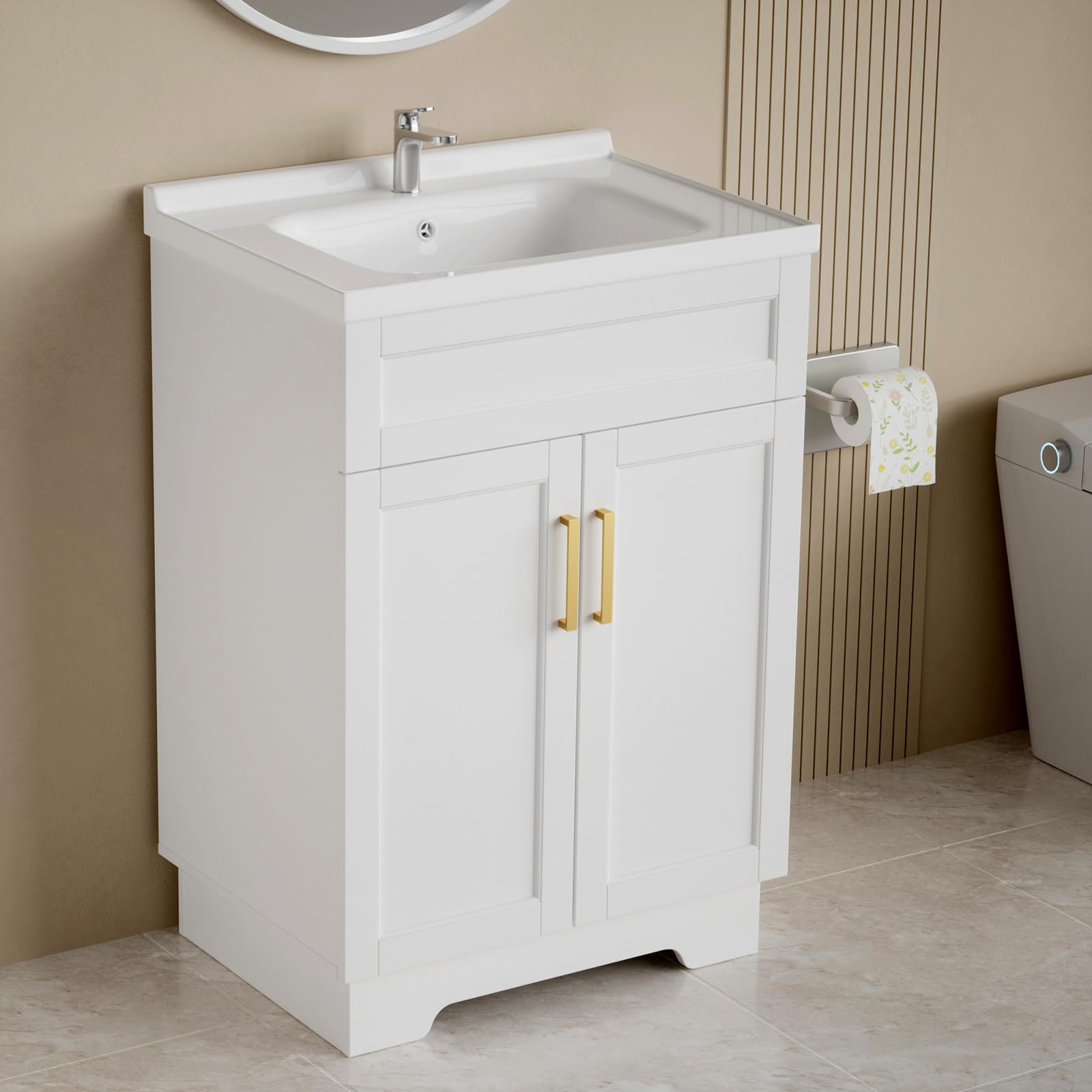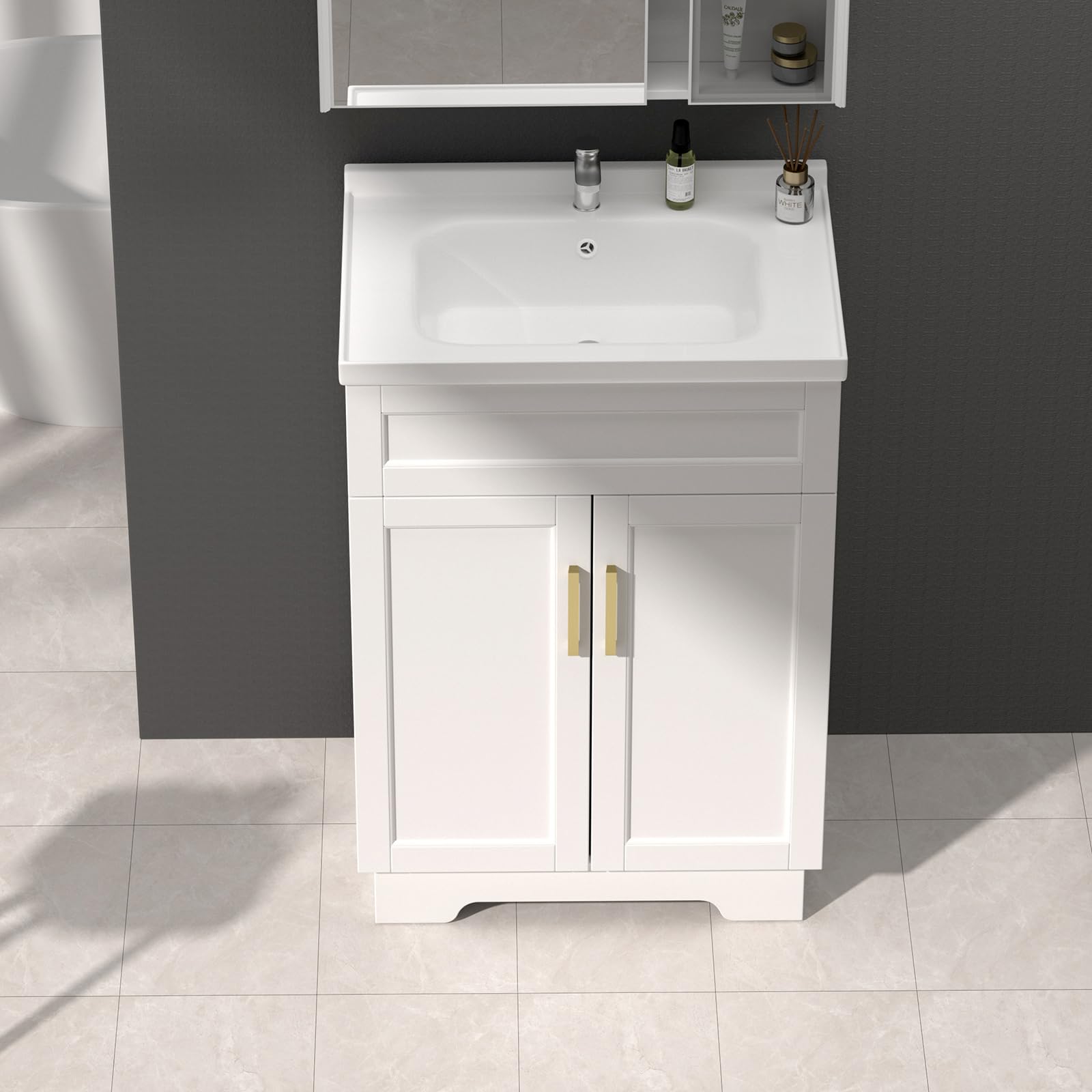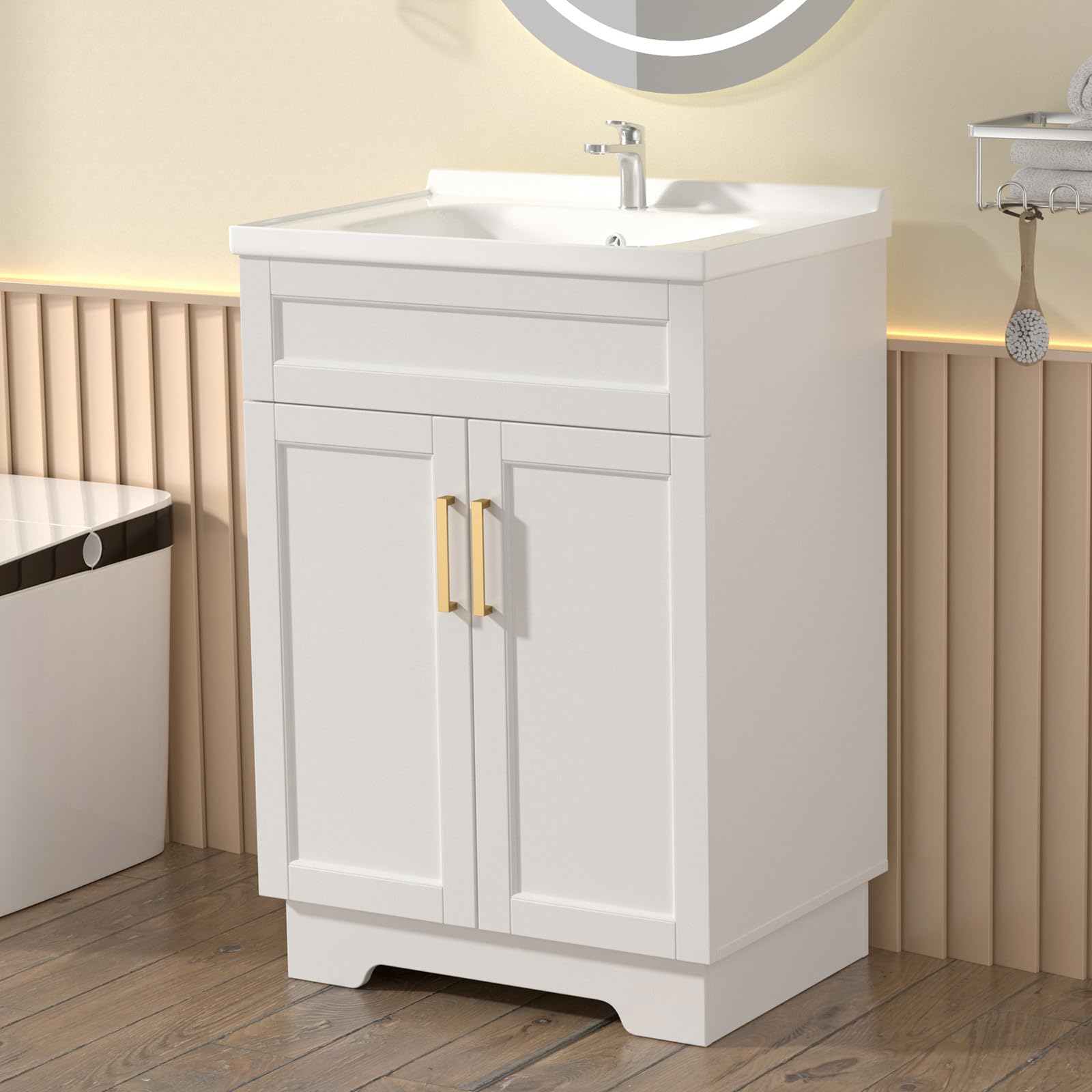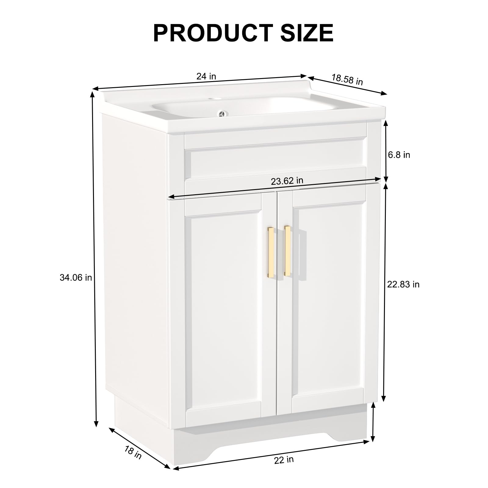 【Bathroom Vanity Sink Size】The closeout bathroom vanity with sink size: 18.4"D x 24"W x 34.7"H. The wooden freestanding bathroom sink vanity with extra large storage space. It can improved the quality of life and ideal for storing some daily necessities such as toothbrush, toothpaste, hand soap, towels, mouthwash, etc.