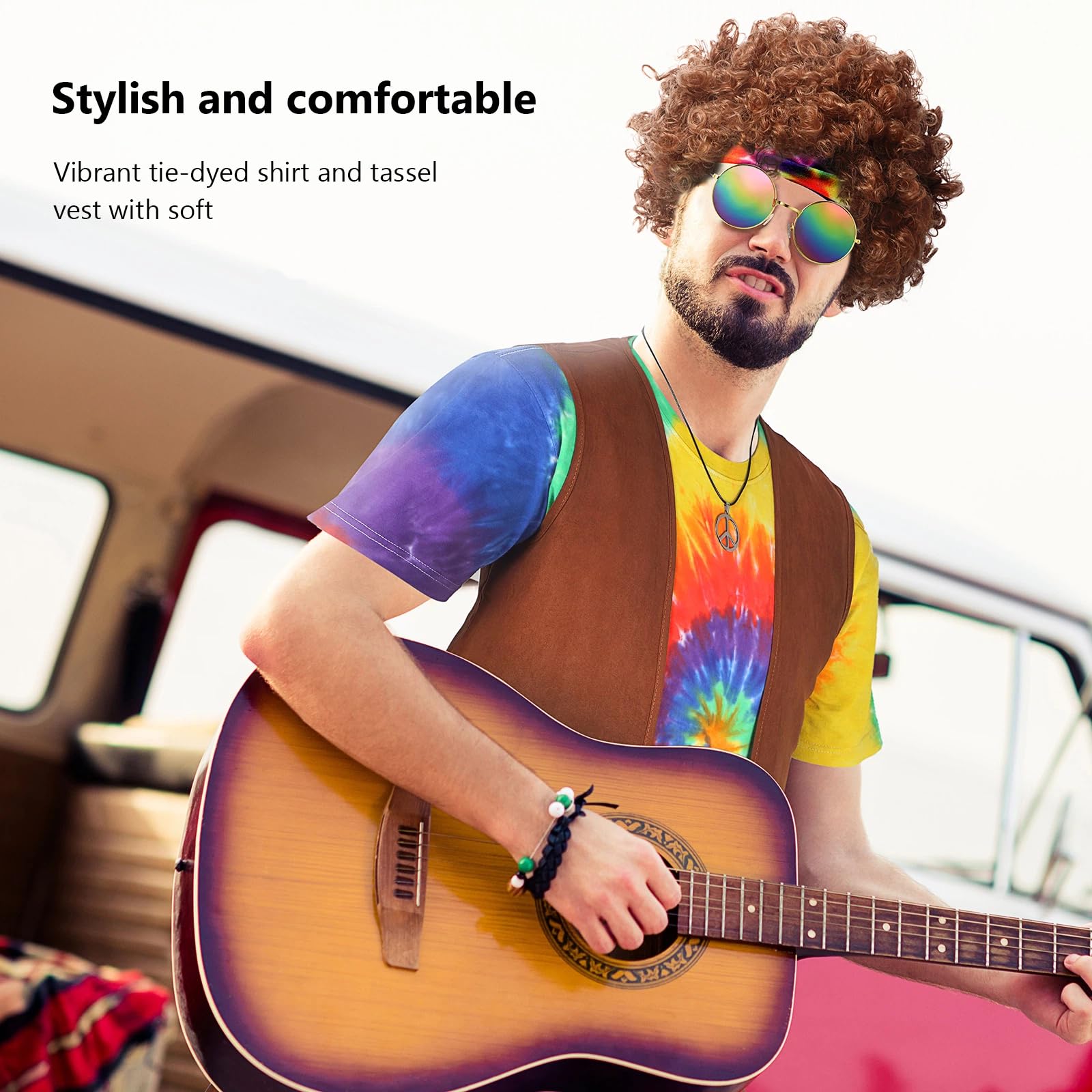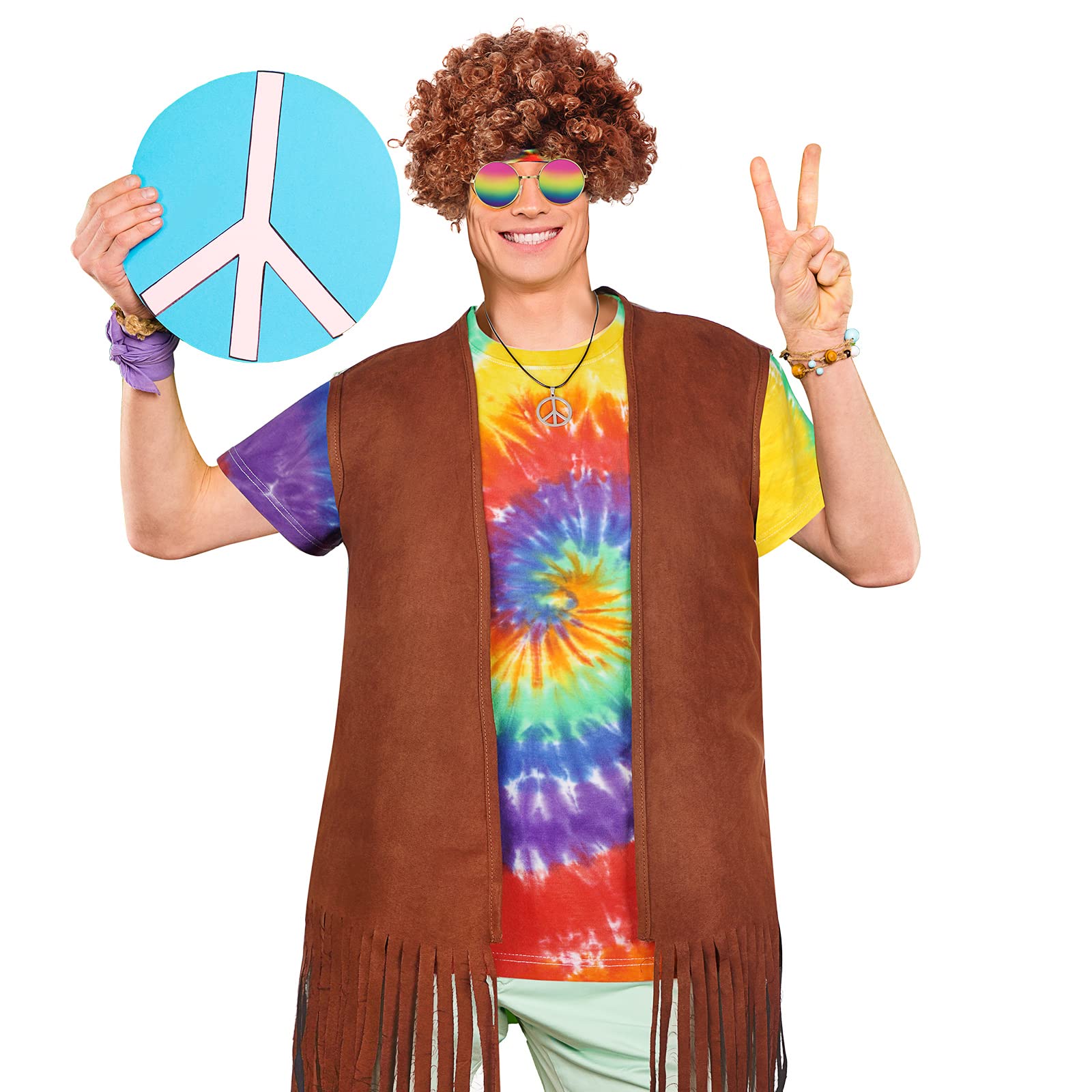 6 Pieces Hippie Costume Set: the package comes with 1 coffee-colored hippie fringed vest, 1 colorful tie dye T shirt, 1 peace sign necklace, 1 brown jumbo Afro wig, 1 hippie headband and 1 pair of hippie glasses, 6 pieces in total, enough to dress you up in hippie style