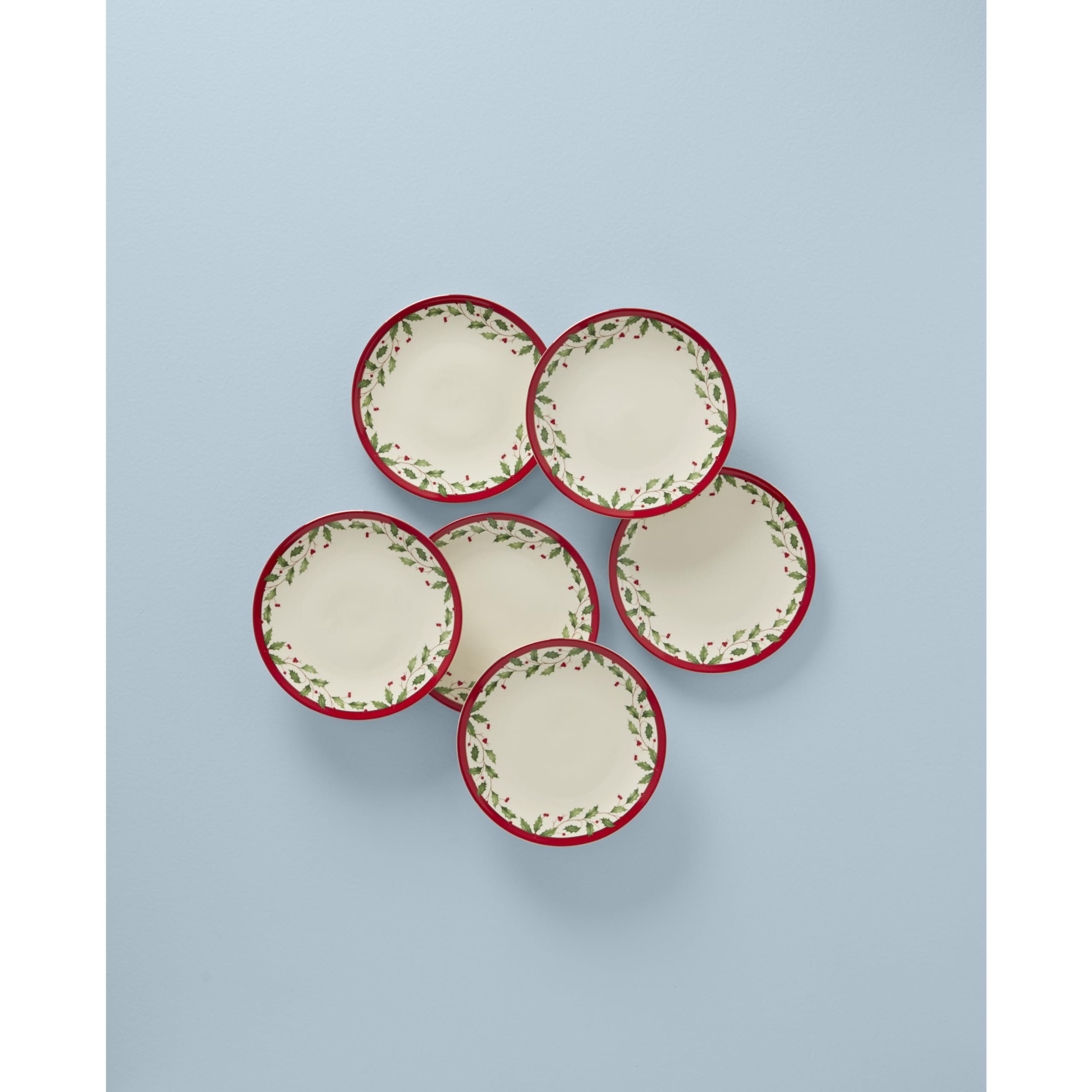 Set the table for the holidays] New to the Holiday collection is this 6-piece set of accent plates. Each one is decorated in the iconic holly motif and is finished with a bright red rim.At Lenox, we strive to make the daily moments in your life a bit more special. Inspired by heritage and designed for now, we bring a rich history of craftsmanship to modern day life. We’ve been a part of homes for over 130 years. Each time you buy Lenox, you are buying a versatile and timeless piece crafted with our century-long commitment to quality, artistry and beauty. Whether you’re gathering the family for dinner, grabbing a midnight snack for yourself in front of the TV or having friends over, Lenox is for real moments that last on products that are meant for living.
