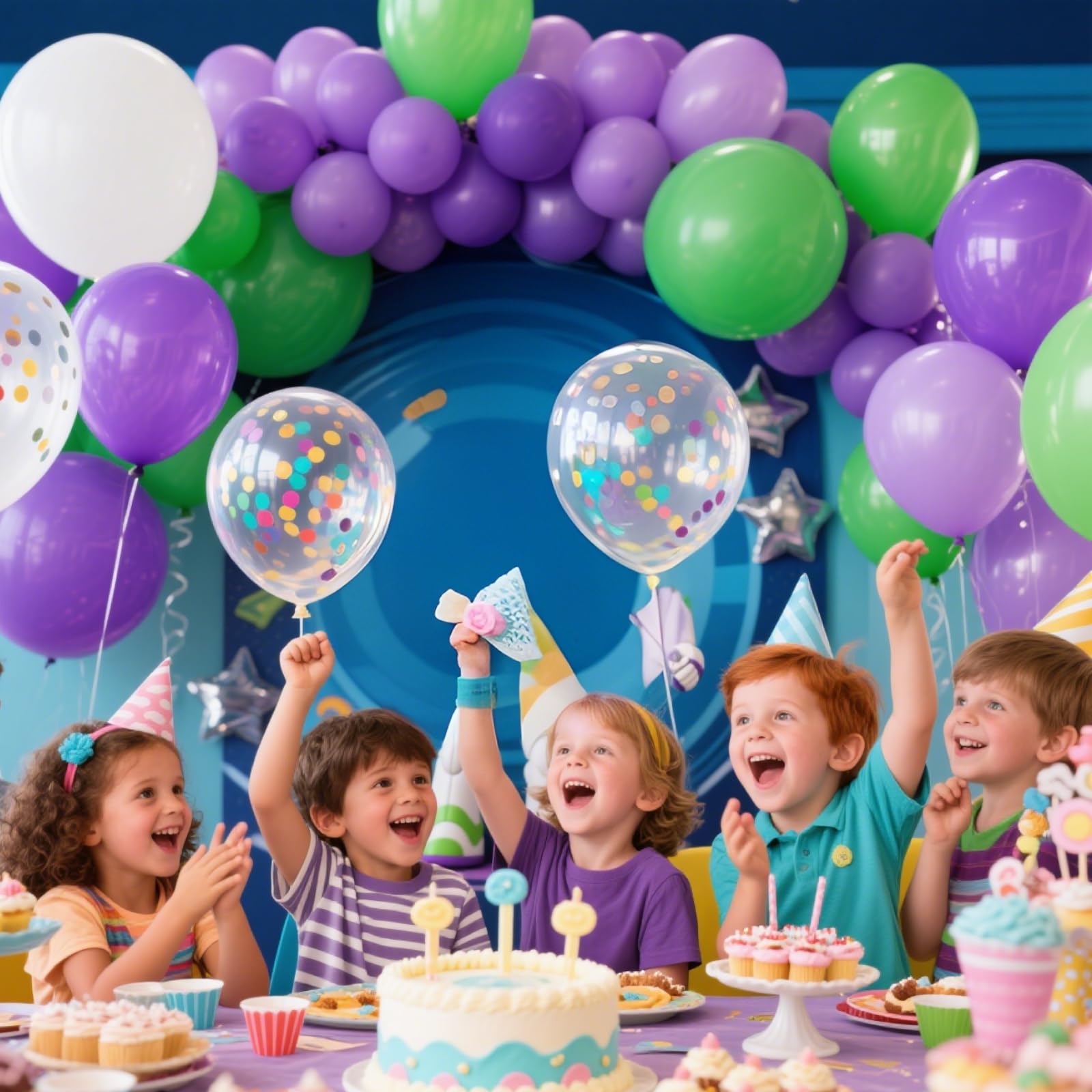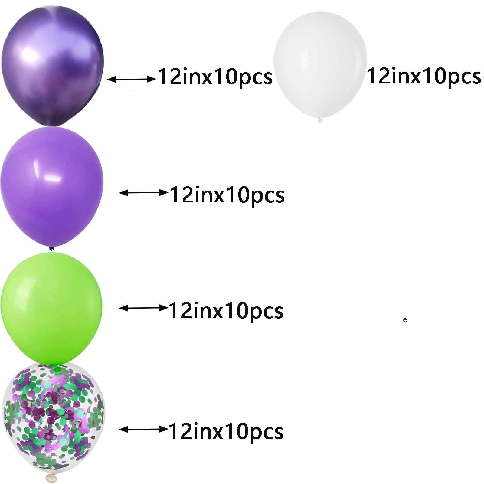 Packaging includes:50 balloons containing10 12 inch purple balloons, 10 12 inch green balloons, 10 12 inch white balloons, and 10 12 inch metal purple balloons, and 10 12 inch purple green Confetti balloons,These balloons enough to decorate your party