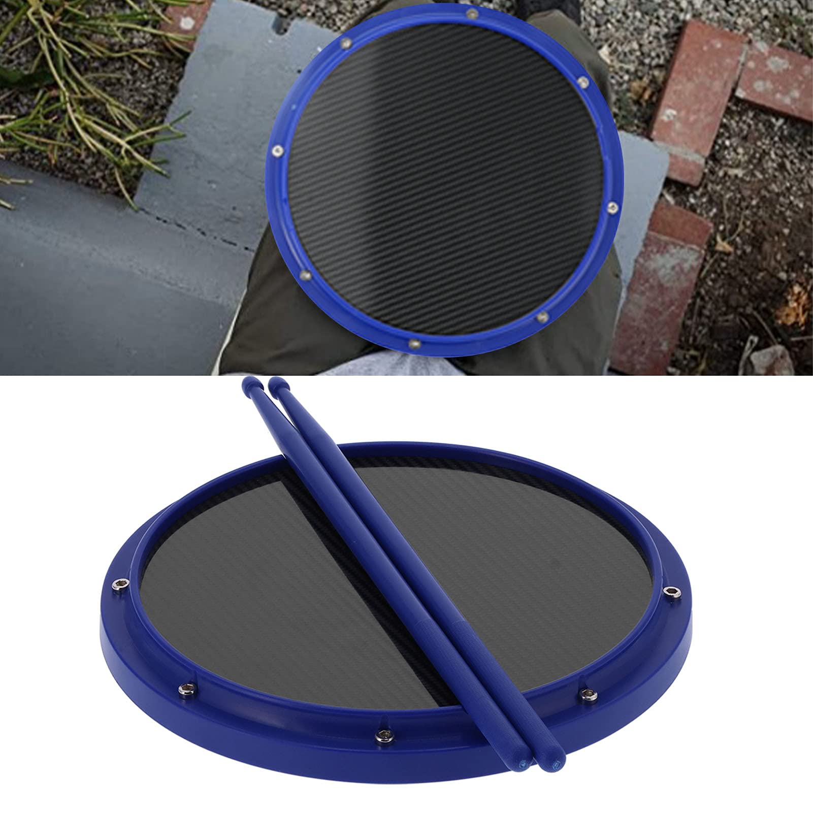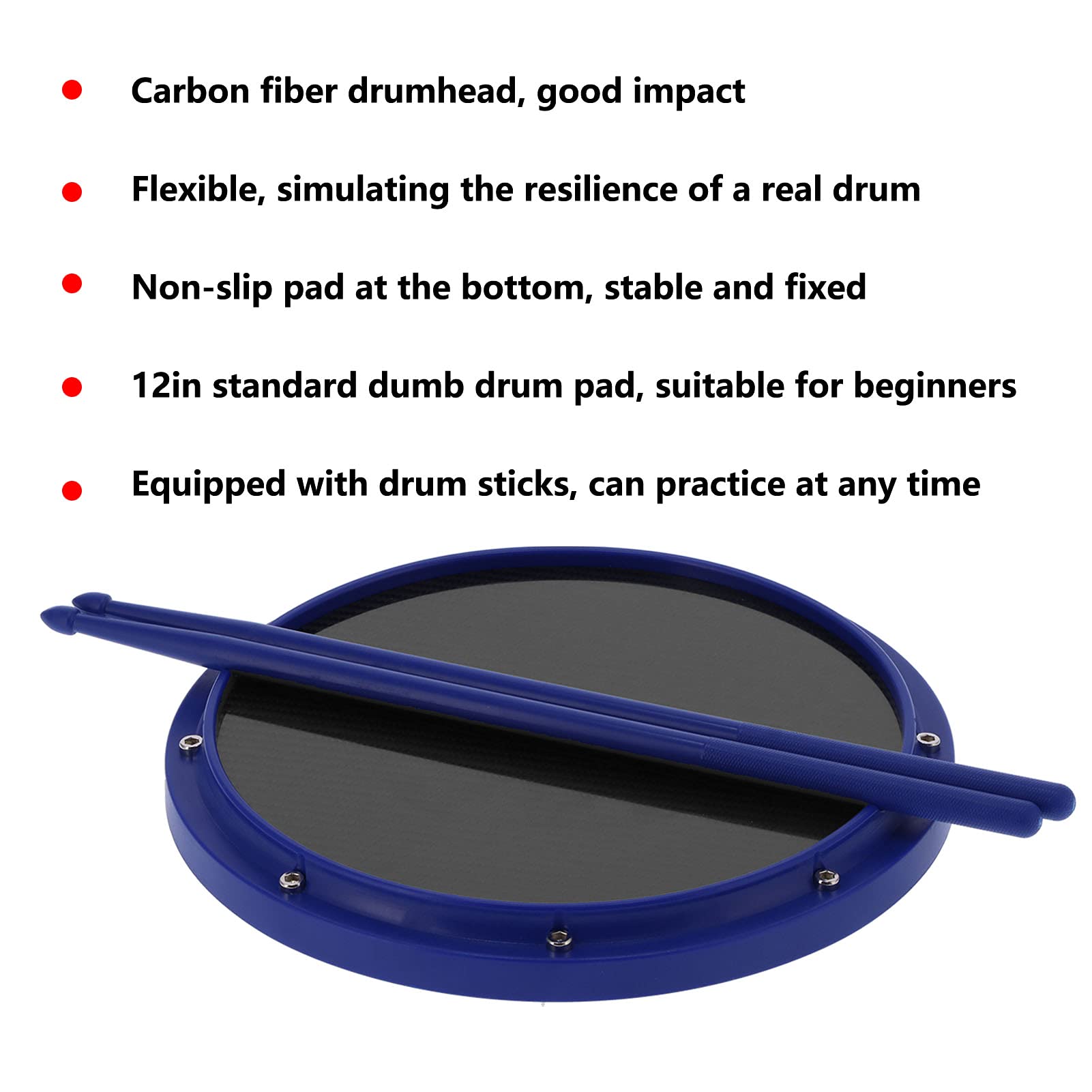 Feature:1. This is a 12in standard dumb drum pad, which is very suitable for beginners to practice instruments.2. The drumhead is made of high‑density carbon fiber, high‑strength ABS to shape, good impact and beautiful appearance.3. The drumhead has good elasticity, which can achieve the resilience of a simulated real drum.4. A soft non‑slip pad is used at the bottom, which can well fix the drum pad on a flat surface.5. Equipped with 2 drumsticks, no need to prepare separately, you can practice percussion anytime and anywhere.Specification:Item Type: Drum PadMaterial: Carbon fiber + ABS + nylonDrumstick Length: Approx. 41cm / 16in Package List:1 x Drum Pad2 x Drumstick