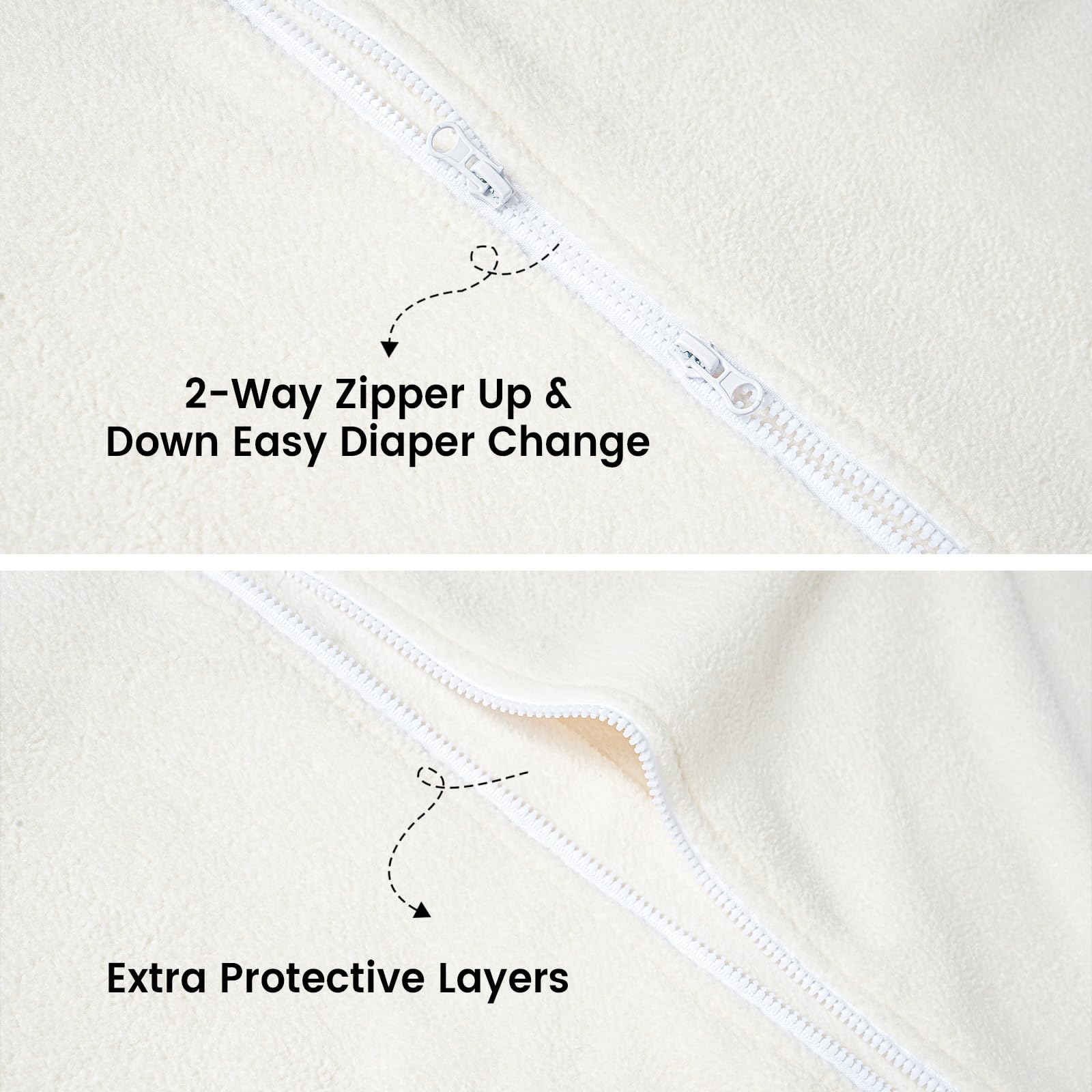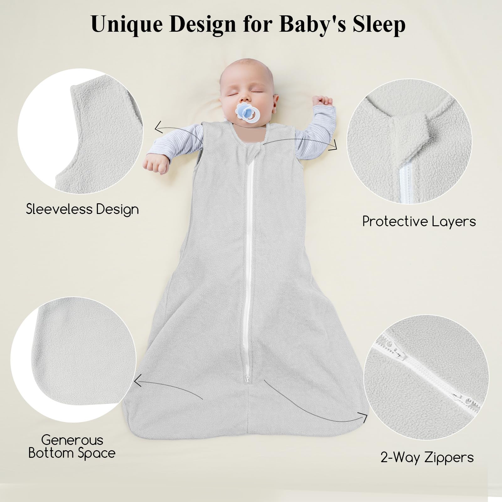 Generous Bottom Space and 2-way Zipper: Our sleeping bags have generous bottom space that allows your baby to kick and move their legs freely. The 2-way zipper makes it easy for you to change your baby's diaper. Our sleep sacks come with protective layers that prevent the zipper from accidentally scratching your baby. The sleeveless design allows free movement of your baby's arms, making it easier for them to roll over and sleep comfortably.